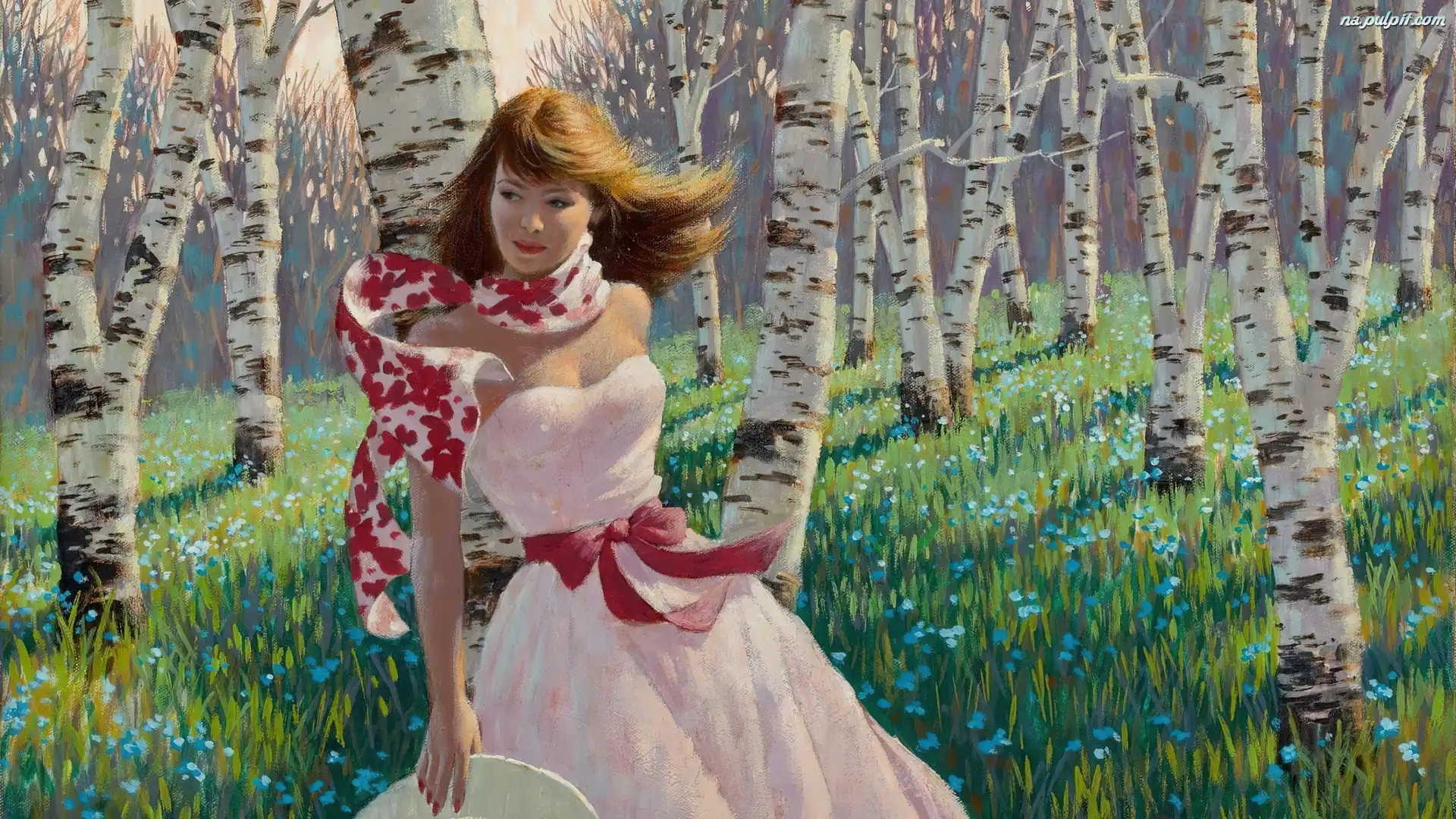 Dziewczyna, Brzozy, Obraz, Kwiaty Na Pulpit