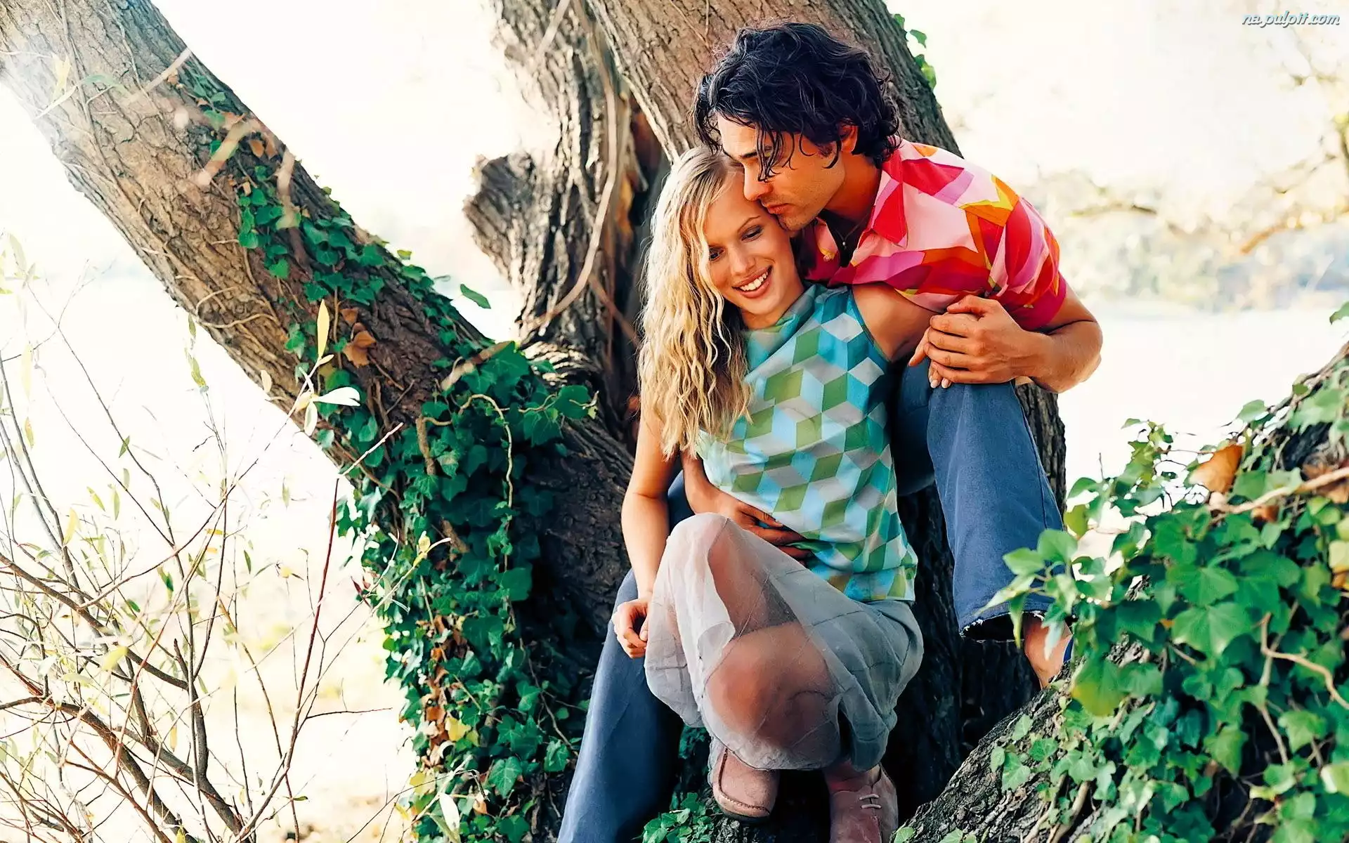 Dziewczyna, Drzewo, Liście, Chłopiec, Para, Zakochani