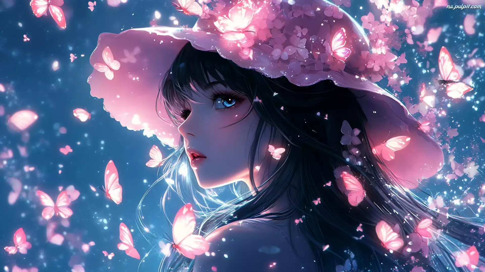Anime, Dziewczyna, Różowy, Motyle, Kapelusz Na Pulpit