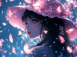 Anime, Dziewczyna, Różowy, Motyle, Kapelusz