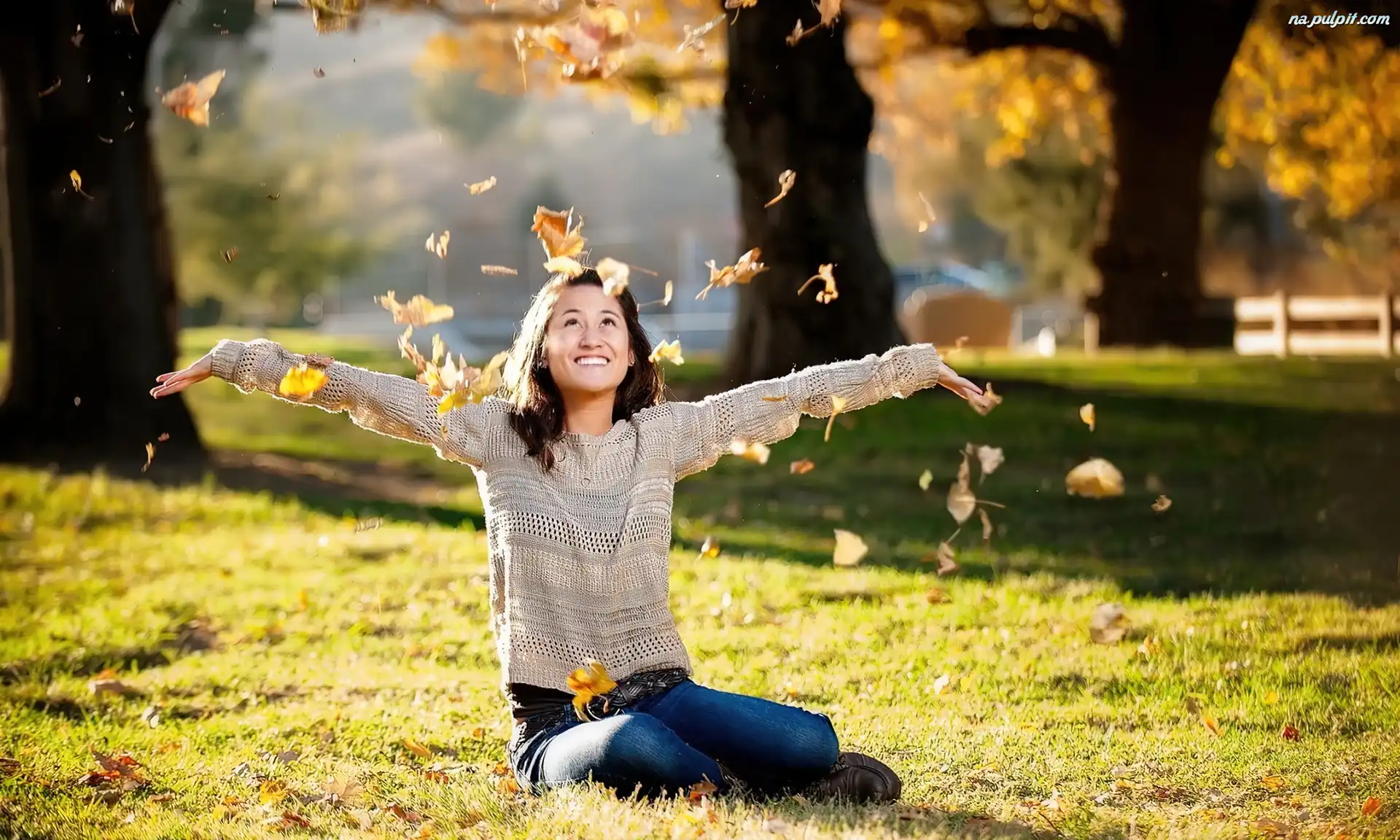 Trawa, Dziewczyna, Liście, Drzewa, Jesień, Radosna, Spadające
