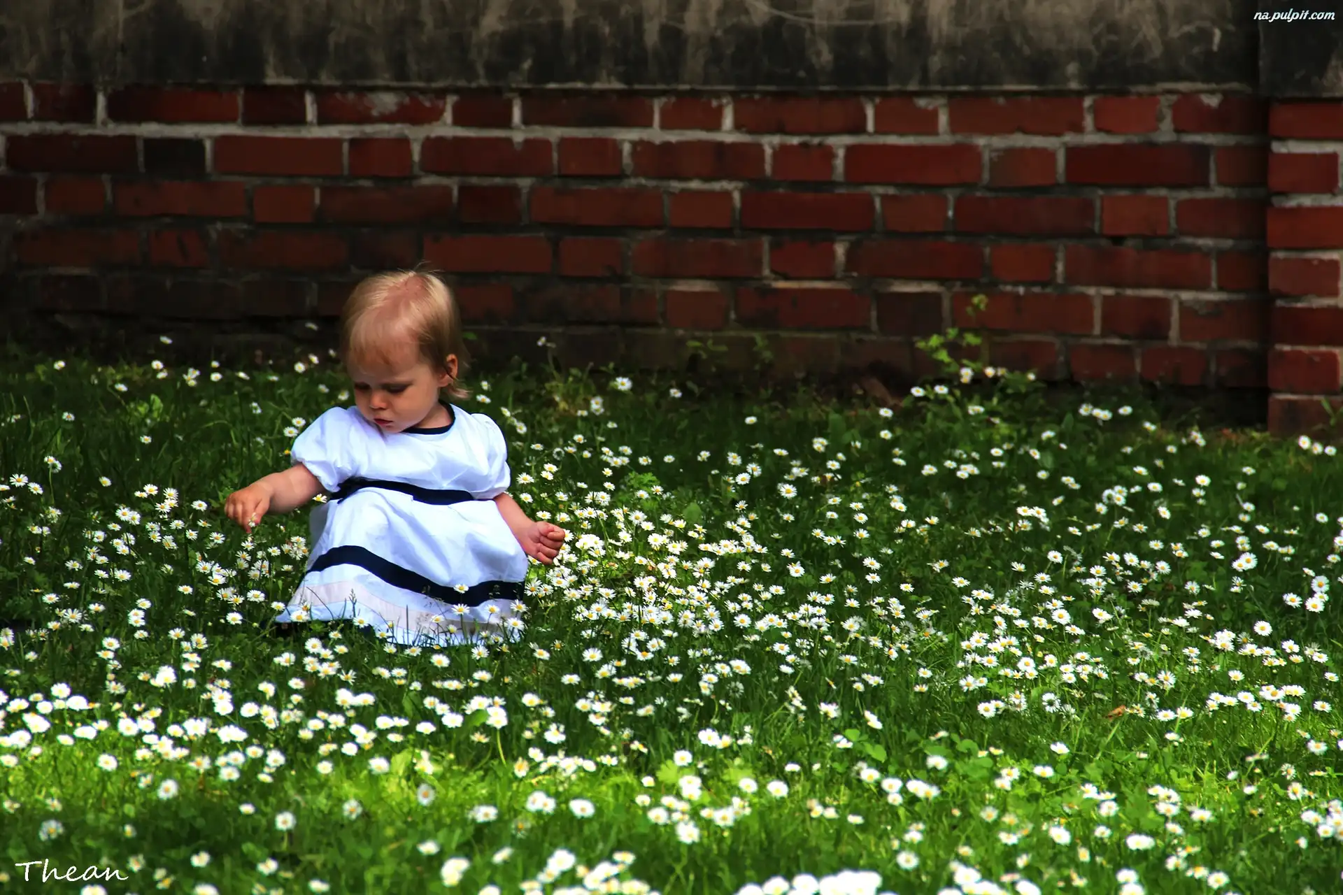 Cegły, Dziewczynka, Mur, Trawa, Sukienka, Mała, Stokrotki Na Pulpit