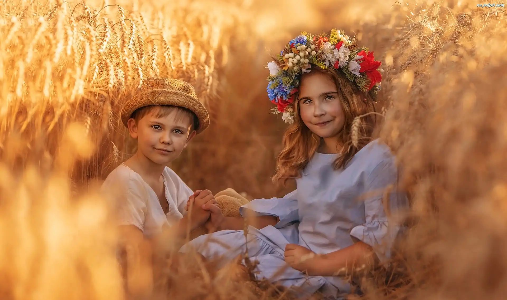 Dziewczynka, Kapelusz, Zboże, Wianek, Dzieci, Chłopiec