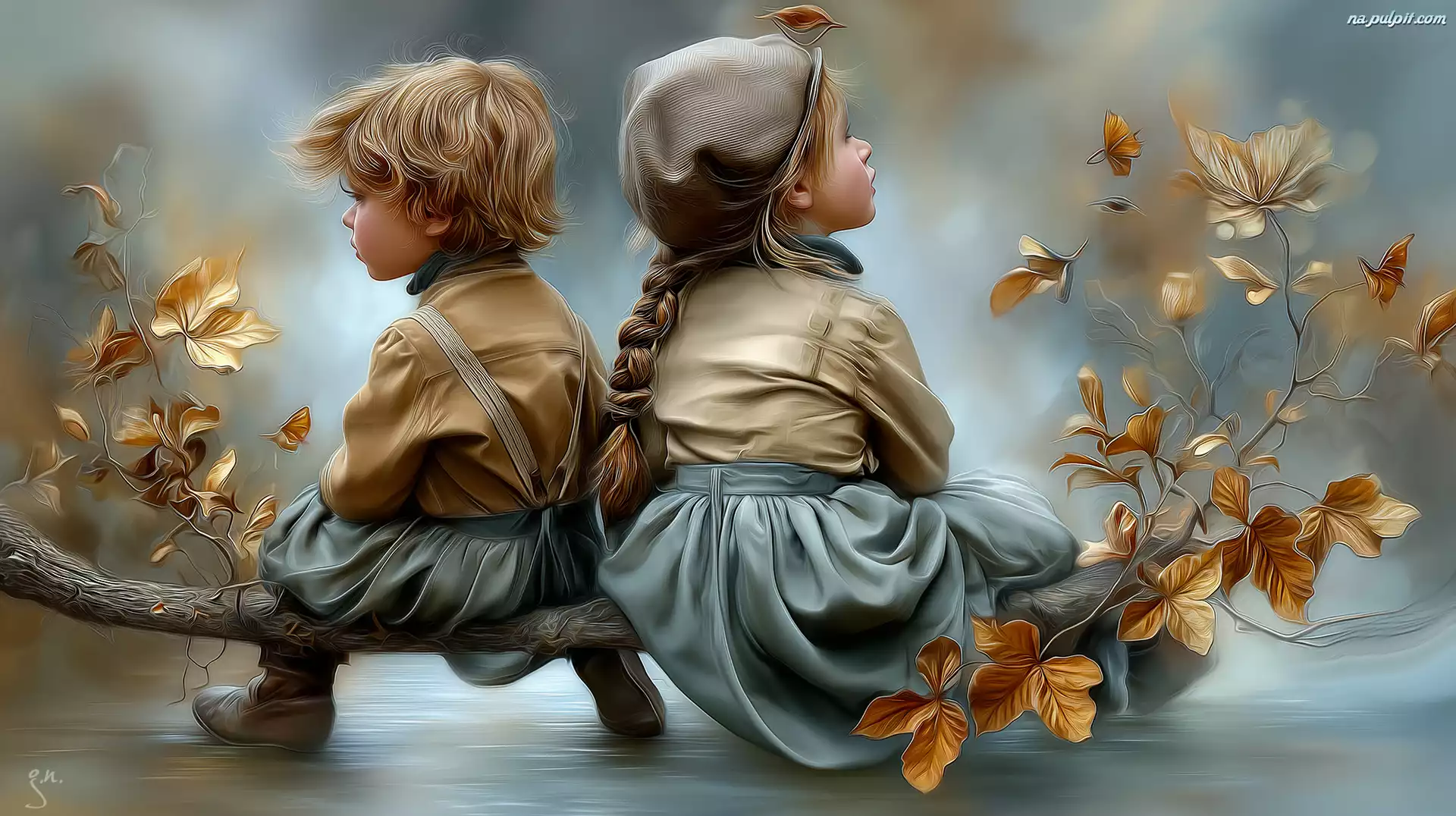 Chłopiec, Dziewczynka, Gałąź, Grafika AI Na Pulpit