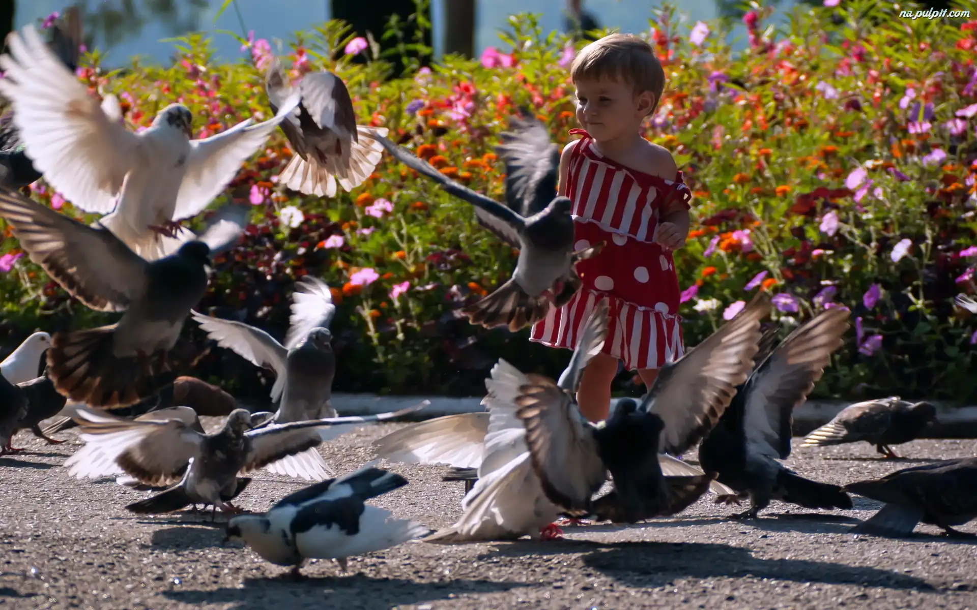 Kwiaty, Dziewczynka, Gołębie Na Pulpit