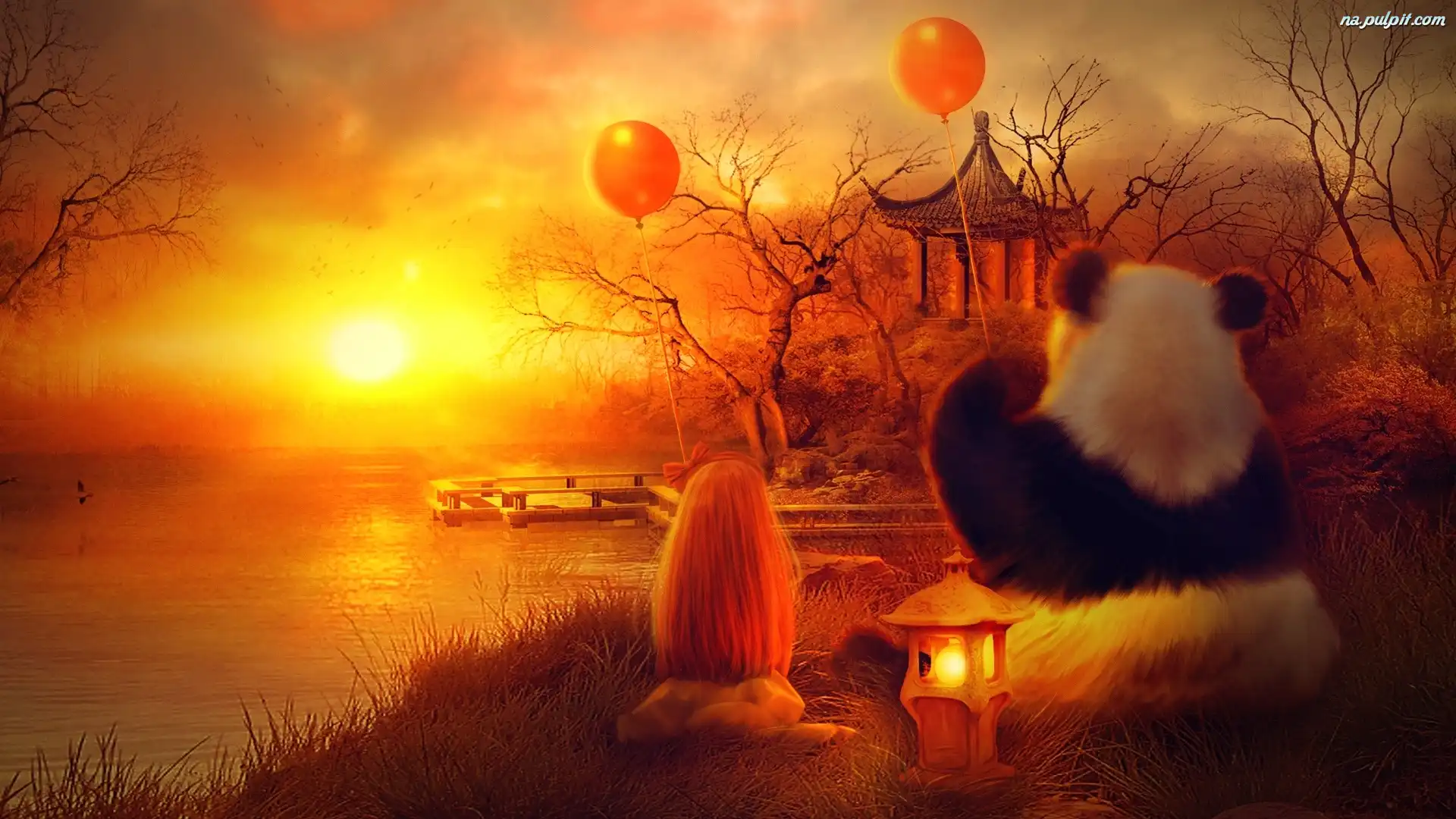 Dziewczynka, Zachód, Słońca, Miś, Mała, Panda Na Pulpit