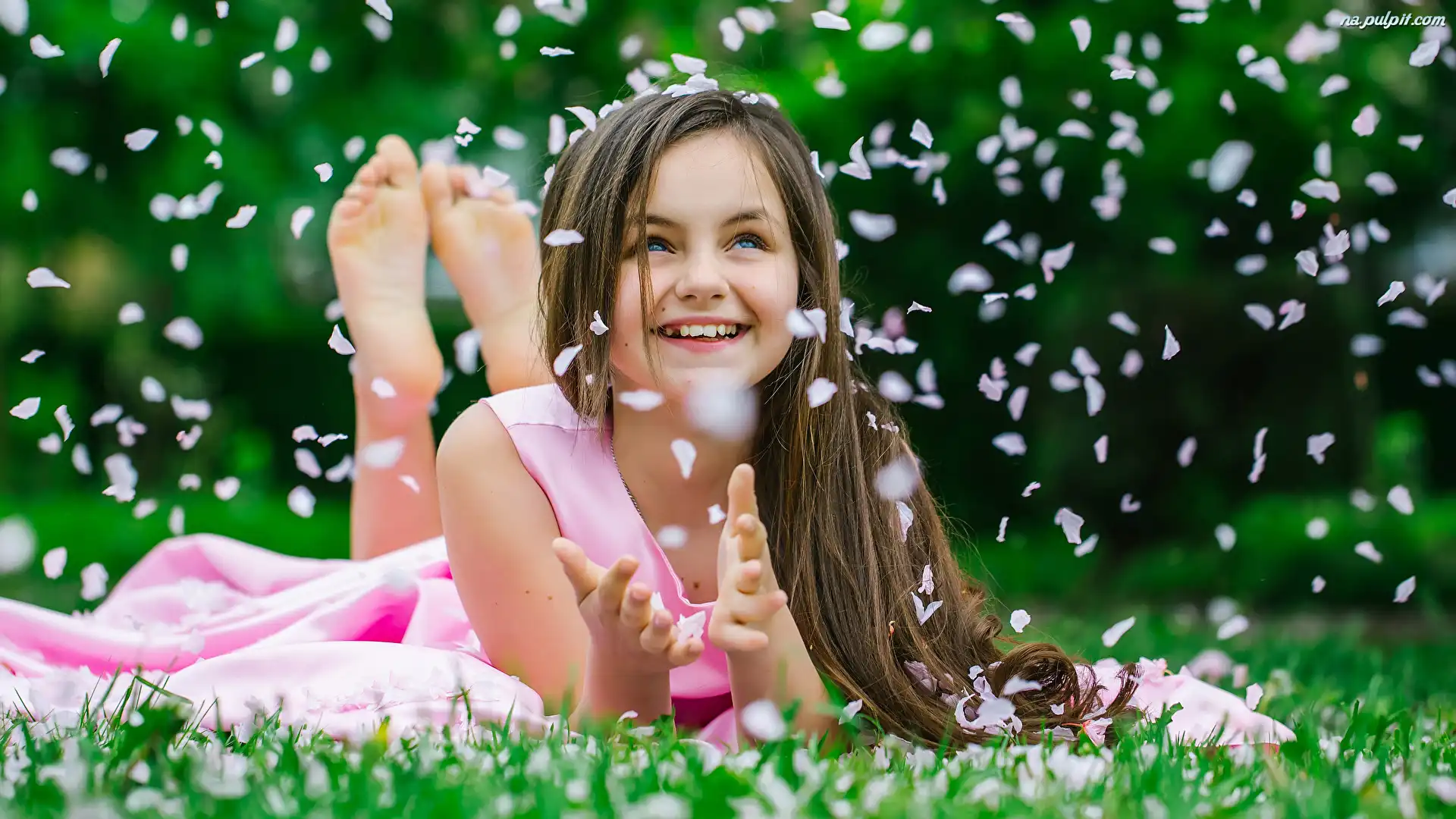 Dziewczynka, Trawa, Płatki, Różowa, Uśmiechnięta, Sukienka Na Pulpit