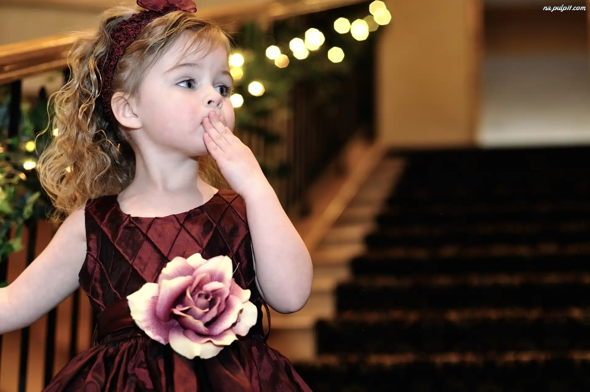 Dziewczynka, Opaska, Schody, Sukienka, Zdziwiona, Róża Na Pulpit