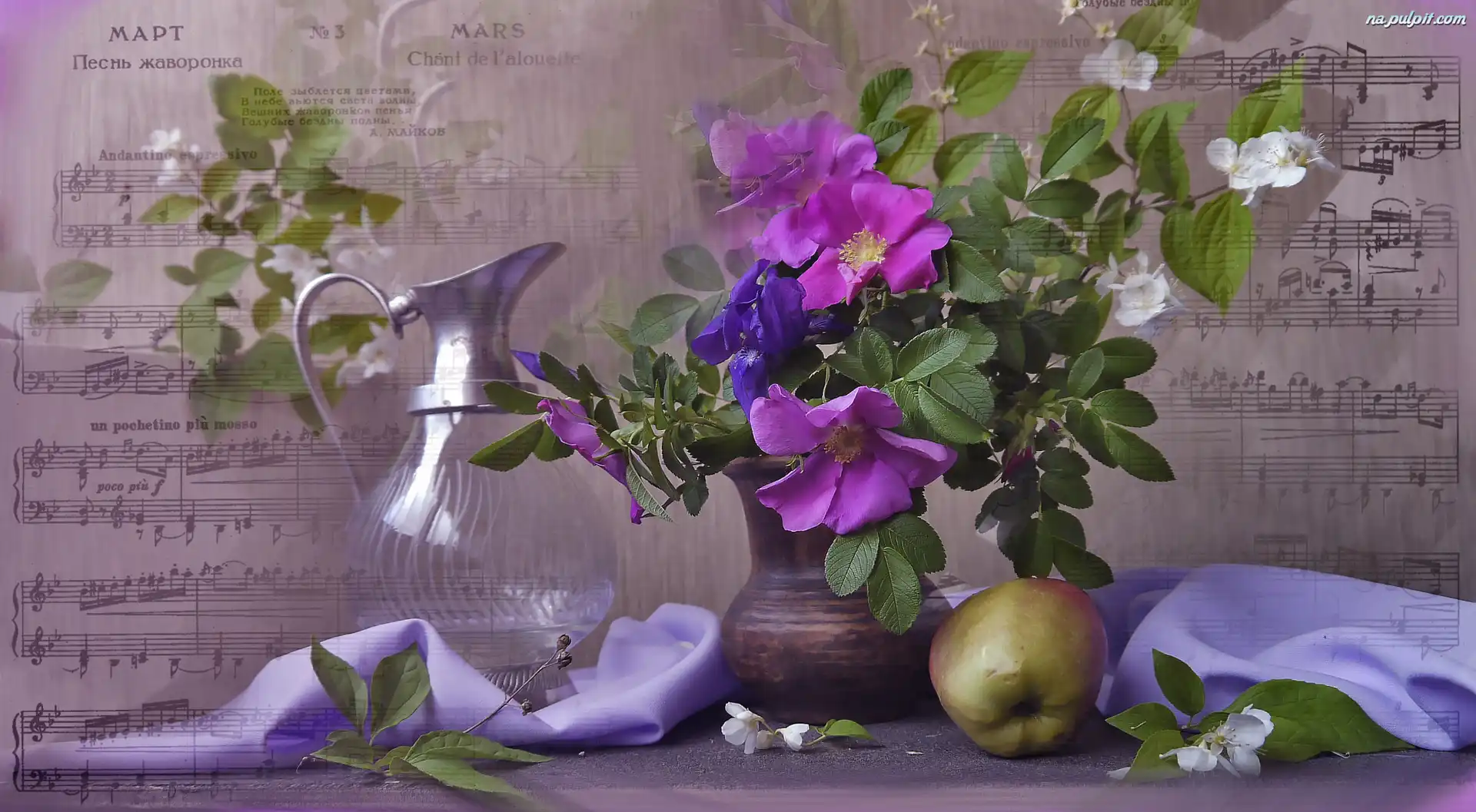 Dzban, Dzika róża, Szklany, Jabłko, Bukiet, Kwiaty, Nuty Na Pulpit