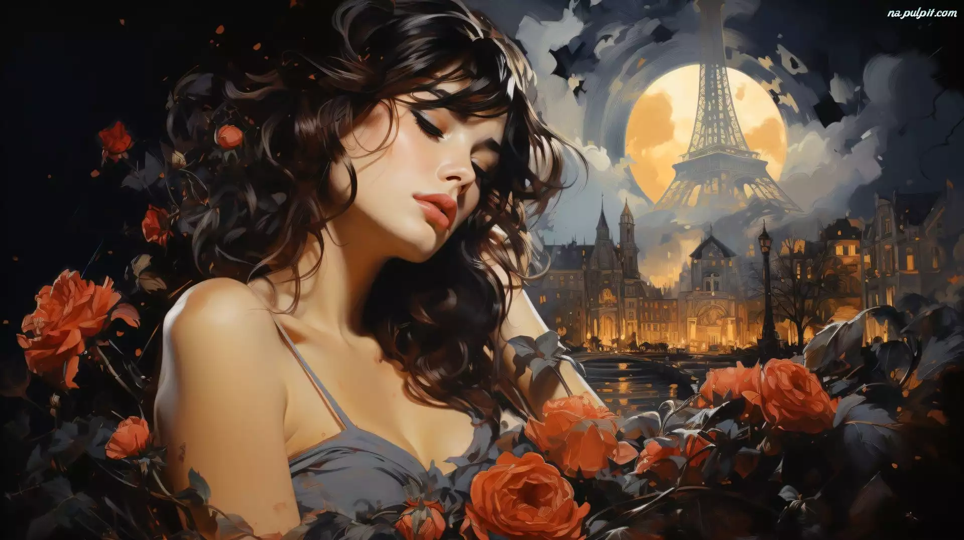 Domy, Kobieta, Wieża Eiffla, Księżyc, Kwiaty, Grafika Na Pulpit