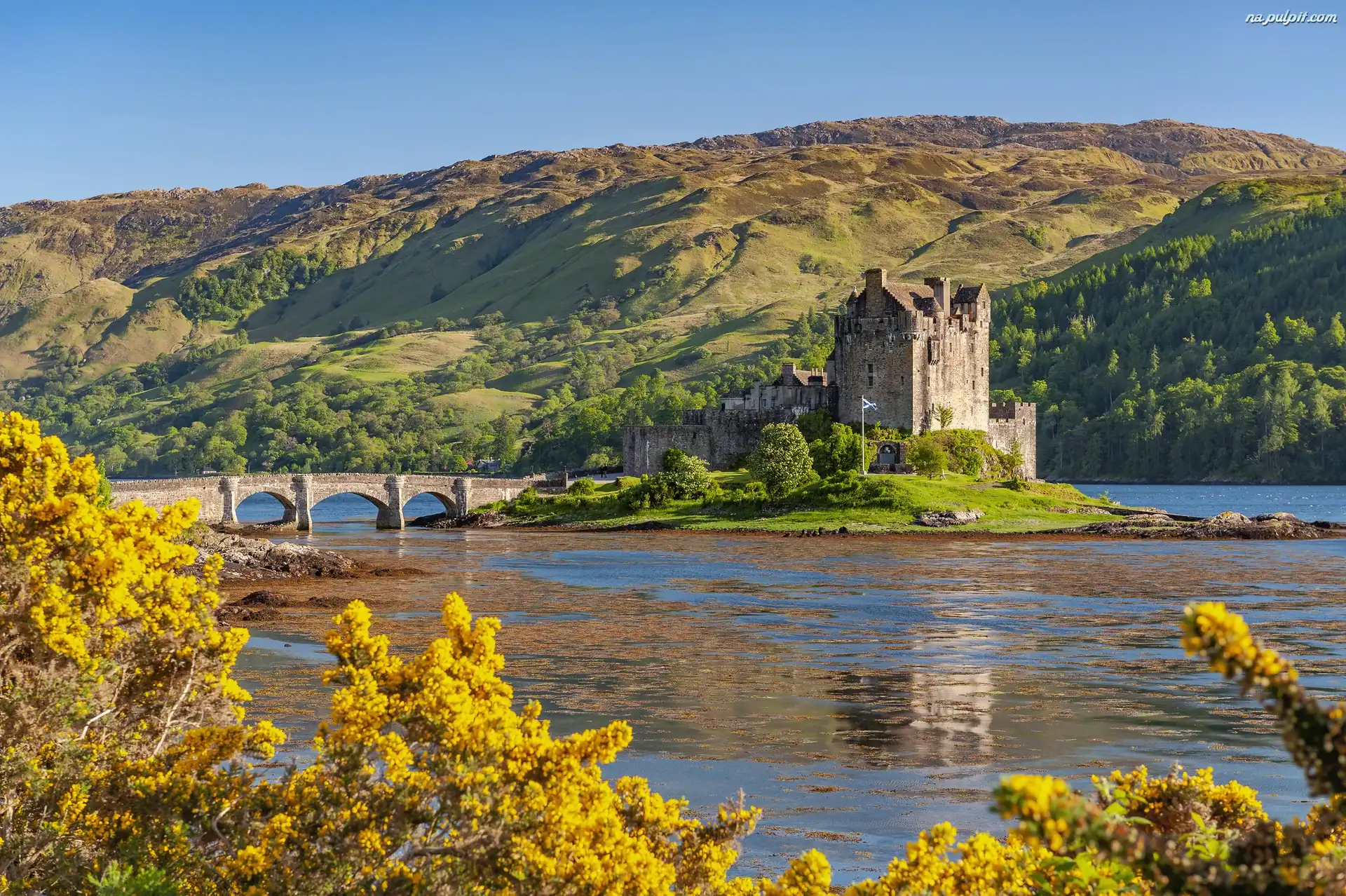 Las, Zamek, Drzewa, Szkocja, Most, Jezioro, Jesień, Eilean Donan Castle, Wzgórza, Loch Duich Eilean Donan Na Pulpit |