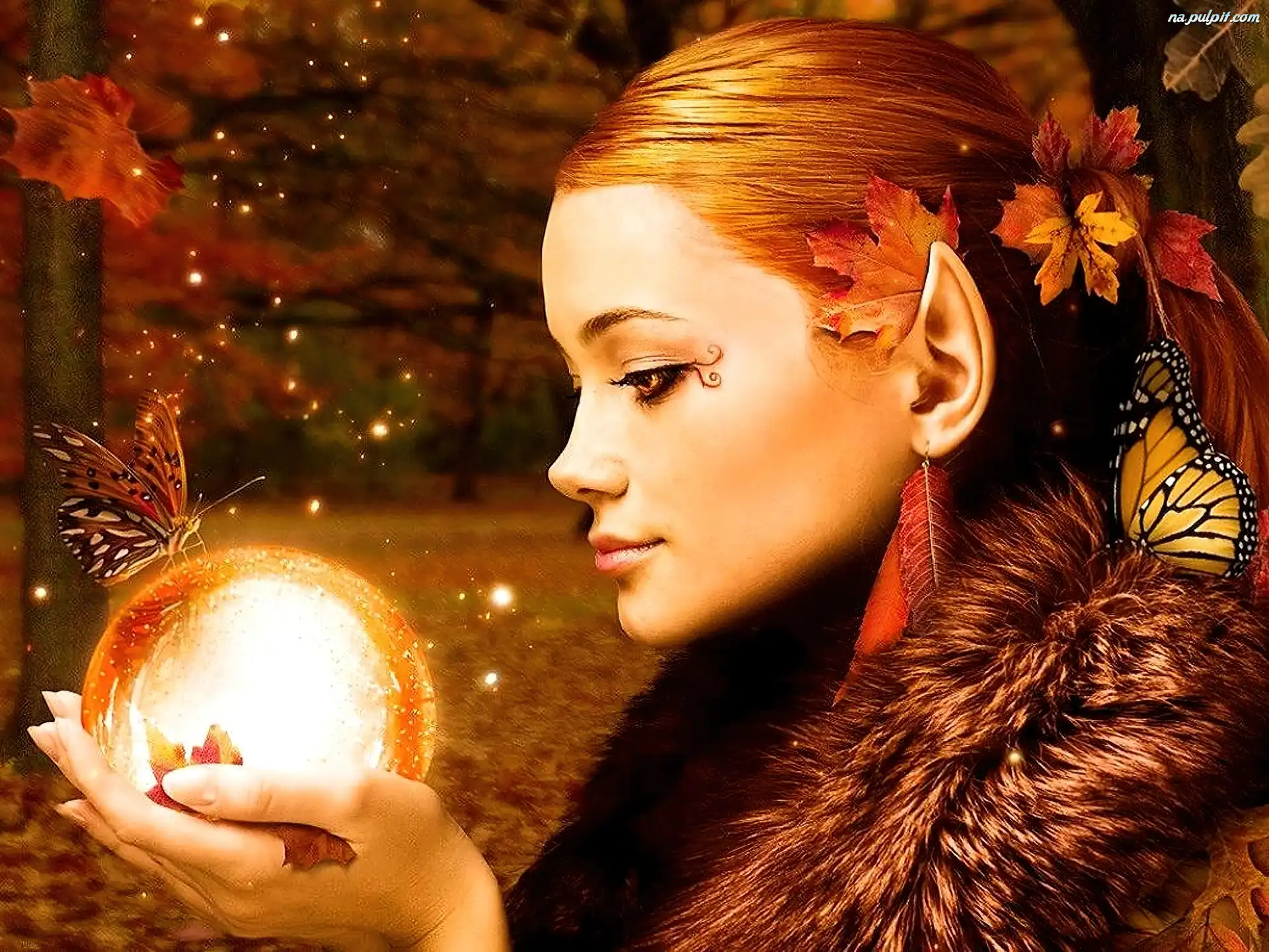 Elf, Motyle, Liście, Szklana, Kobieta, Kula