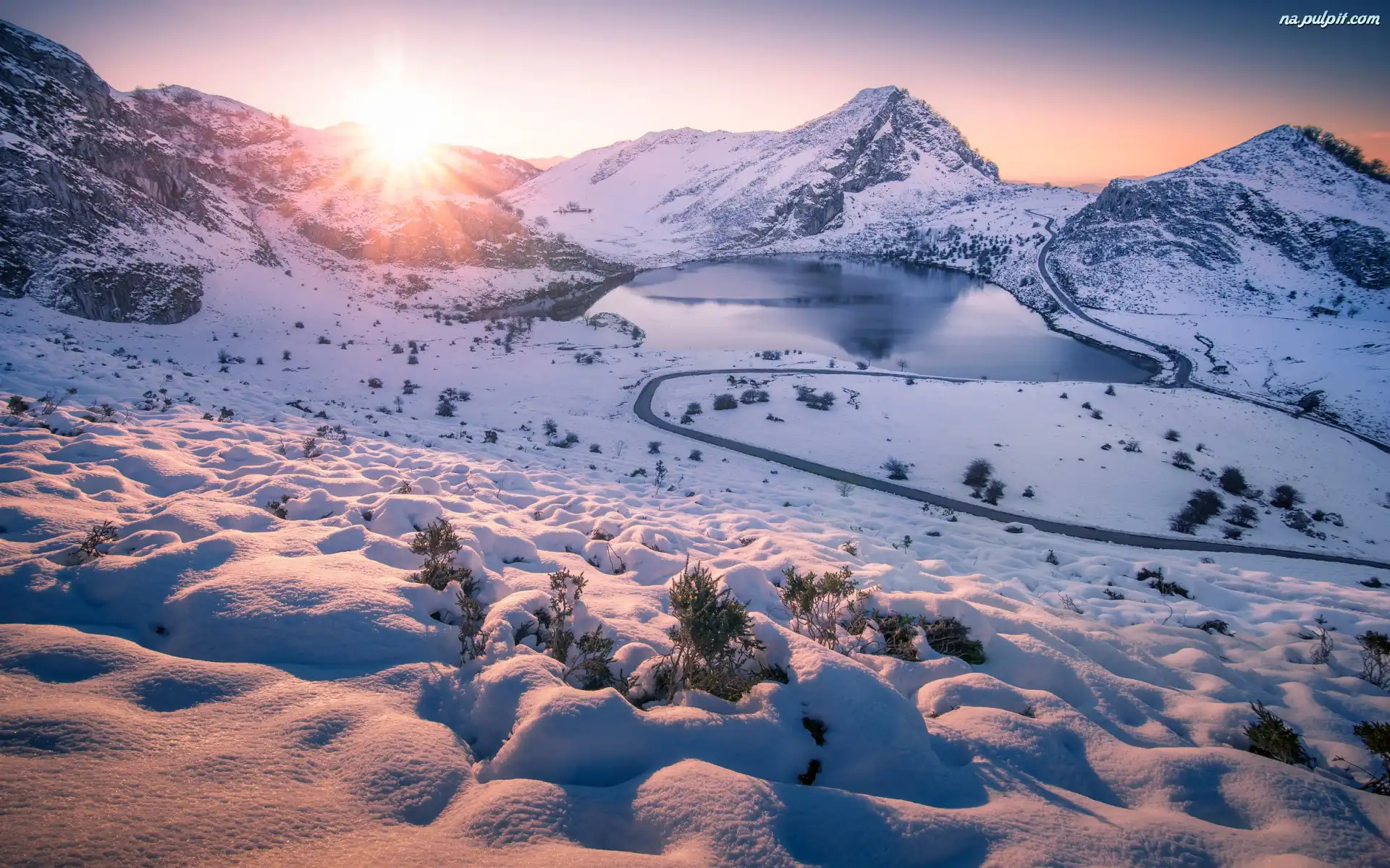 Picos de Europa, Śnieg, Jezioro, Asturia, Hiszpania, Lake Enol, Zima, Góry Na Pulpit