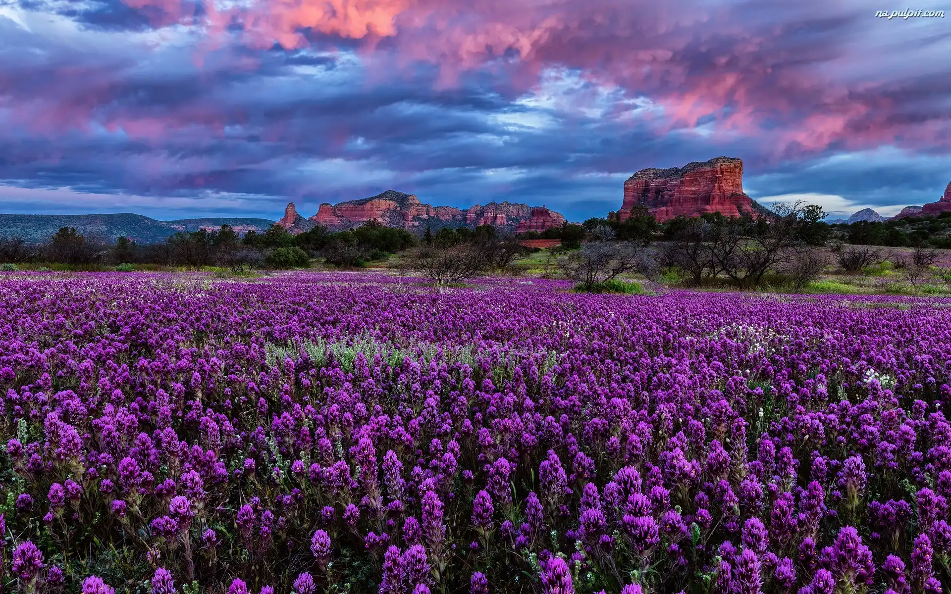 Arizona, Stany Zjednoczone, Skały, Kwiaty, Castilleja exserta, Łąka, Góry, Chmury, Drzewa Na Pulpit