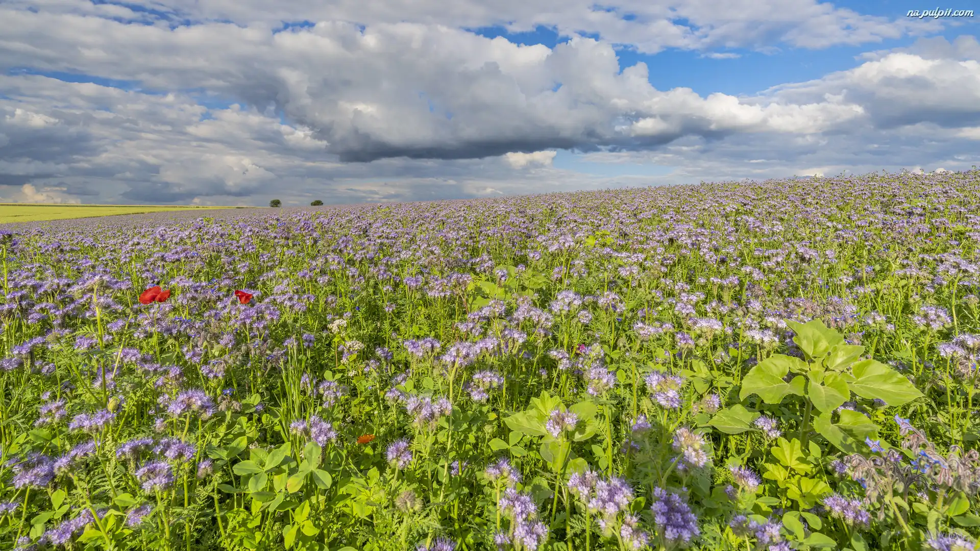 Drzewa, Lato, Kwiaty, Facelia, Pole, Chmury Na Pulpit