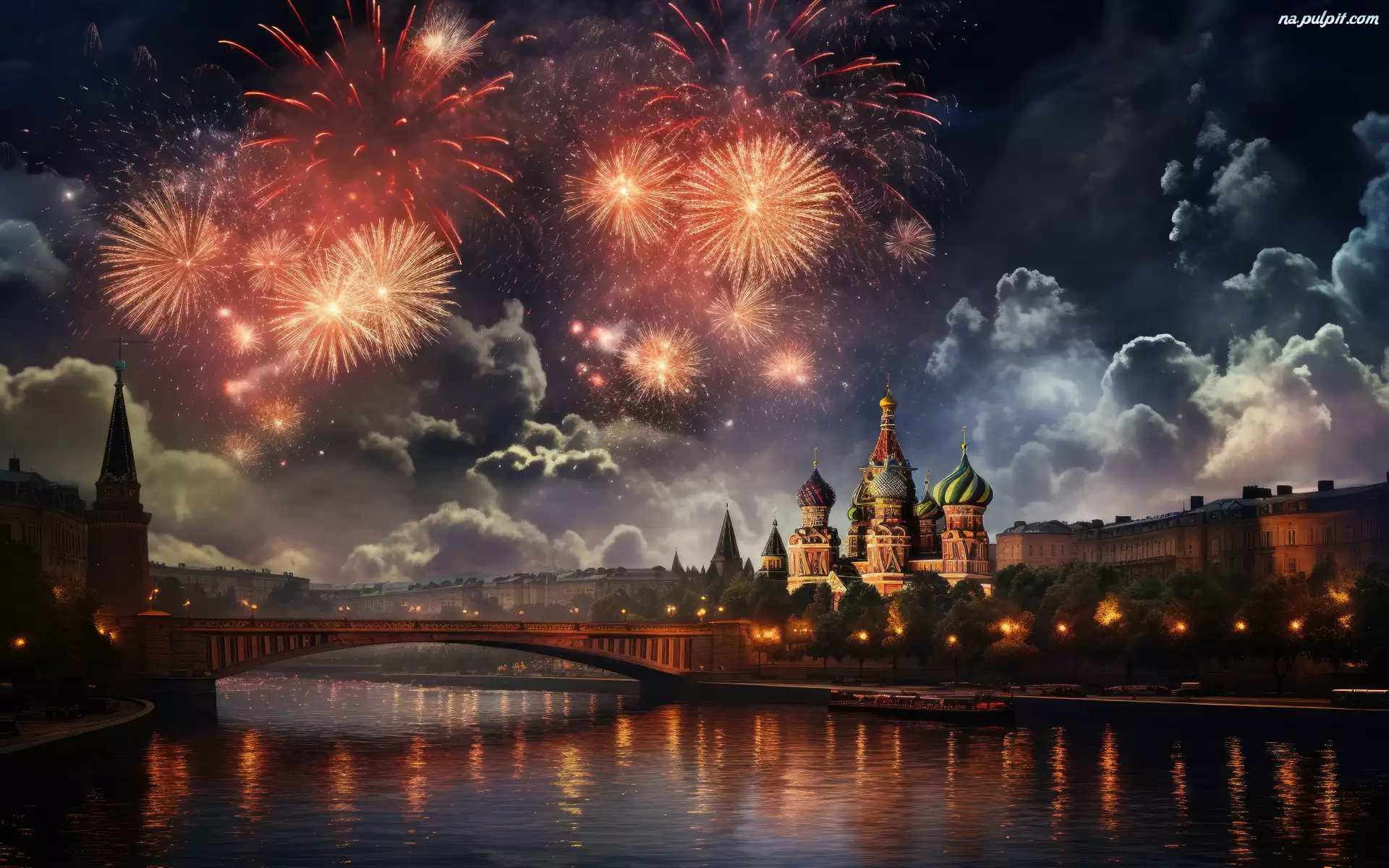 Moskwa, Rzeka, Rosja, Fajerwerki, Cerkiew, Noc, Nowy Rok, Most, Sobór Wasyla Błogosławionego, Niebo Na Pulpit |