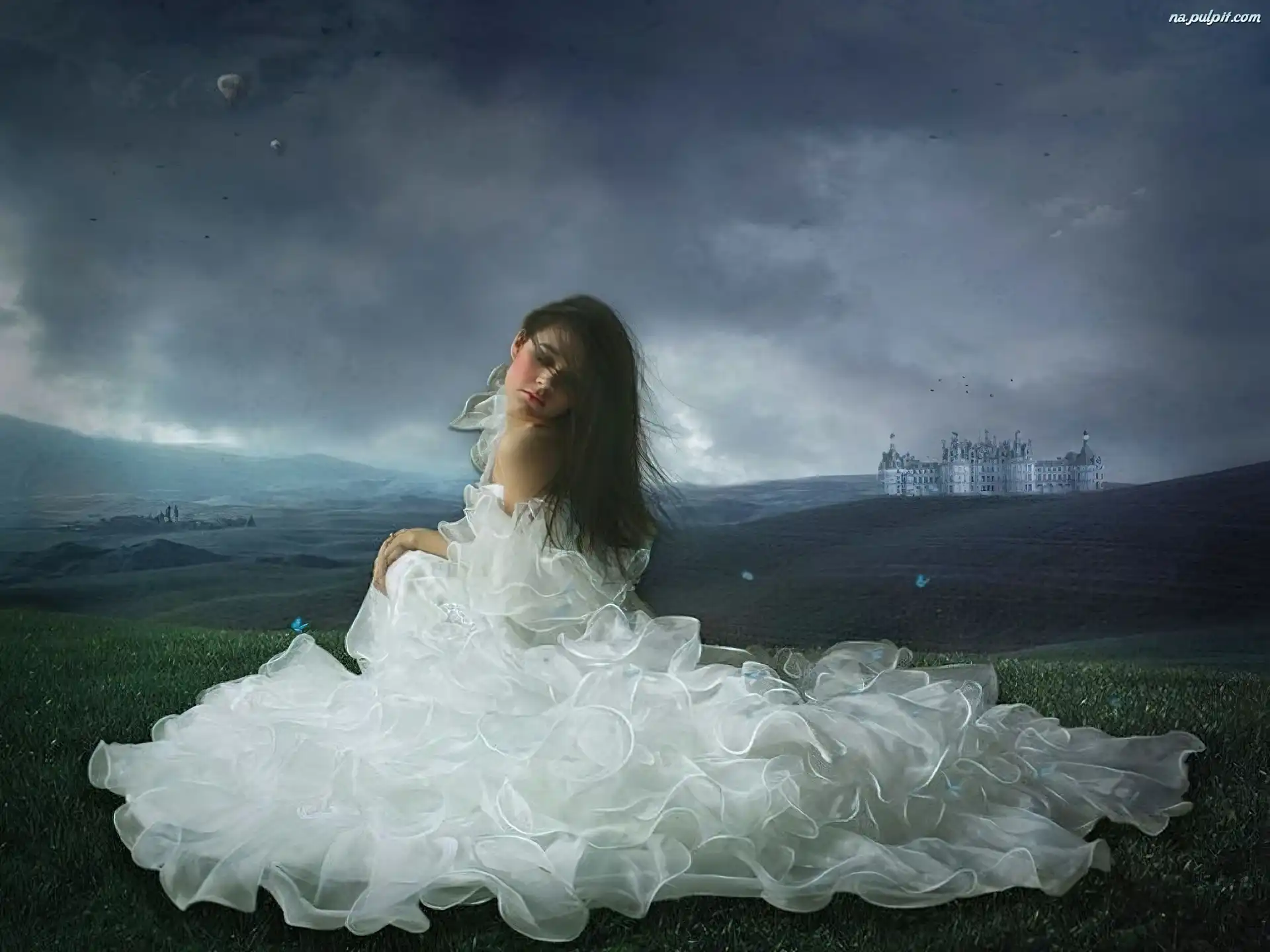 Falbany, Biała, Kobieta, Suknia