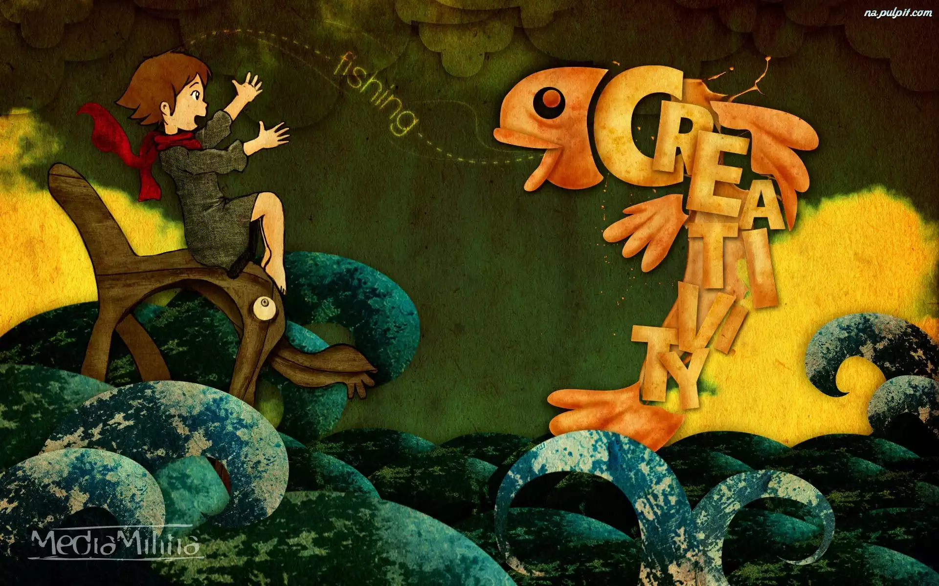 Krzesło, Fale, Grafika 2D, Ryba, Dziewczynka, Napisy