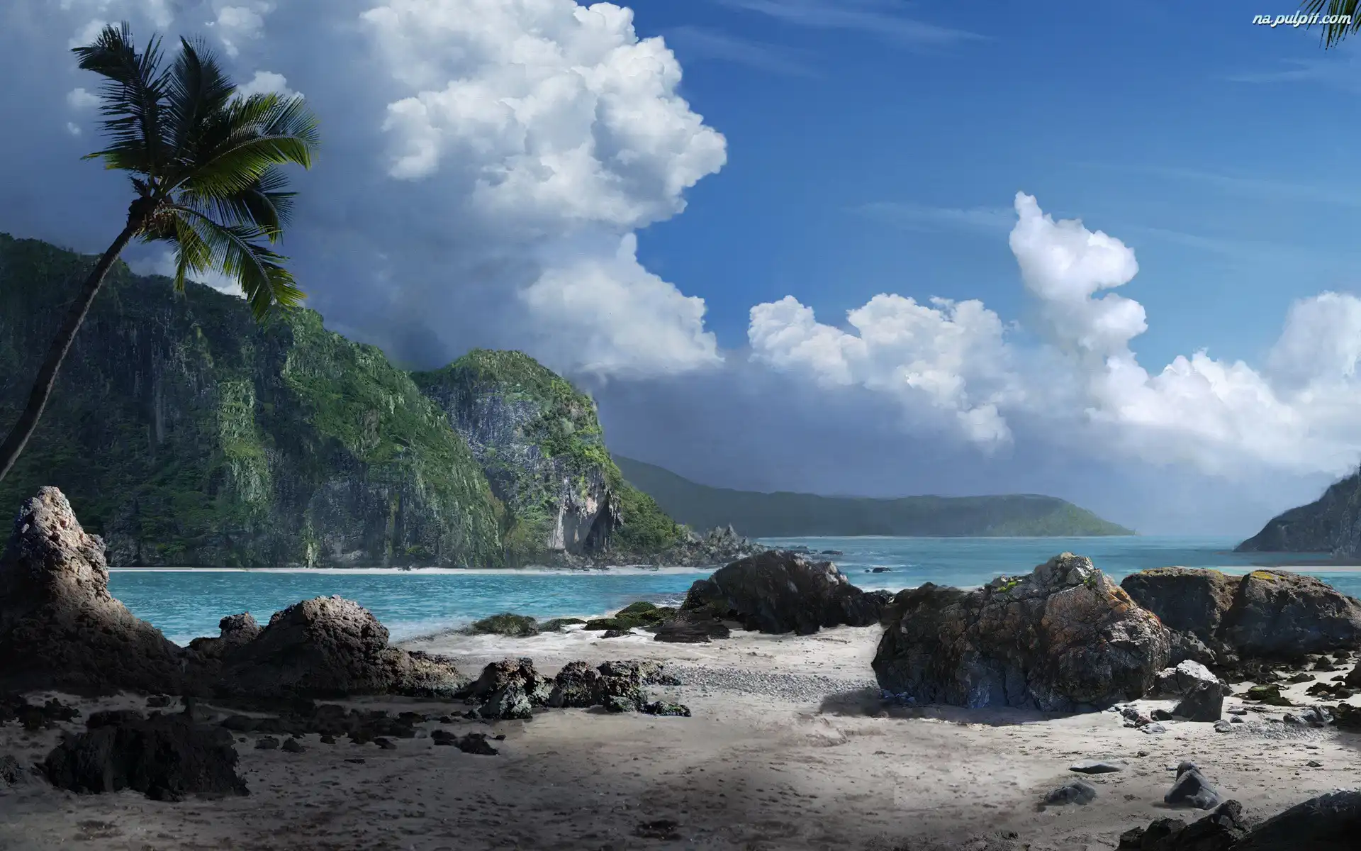 Fale, Skały, Palma, Plaża, Morze, Kamienie Na Pulpit