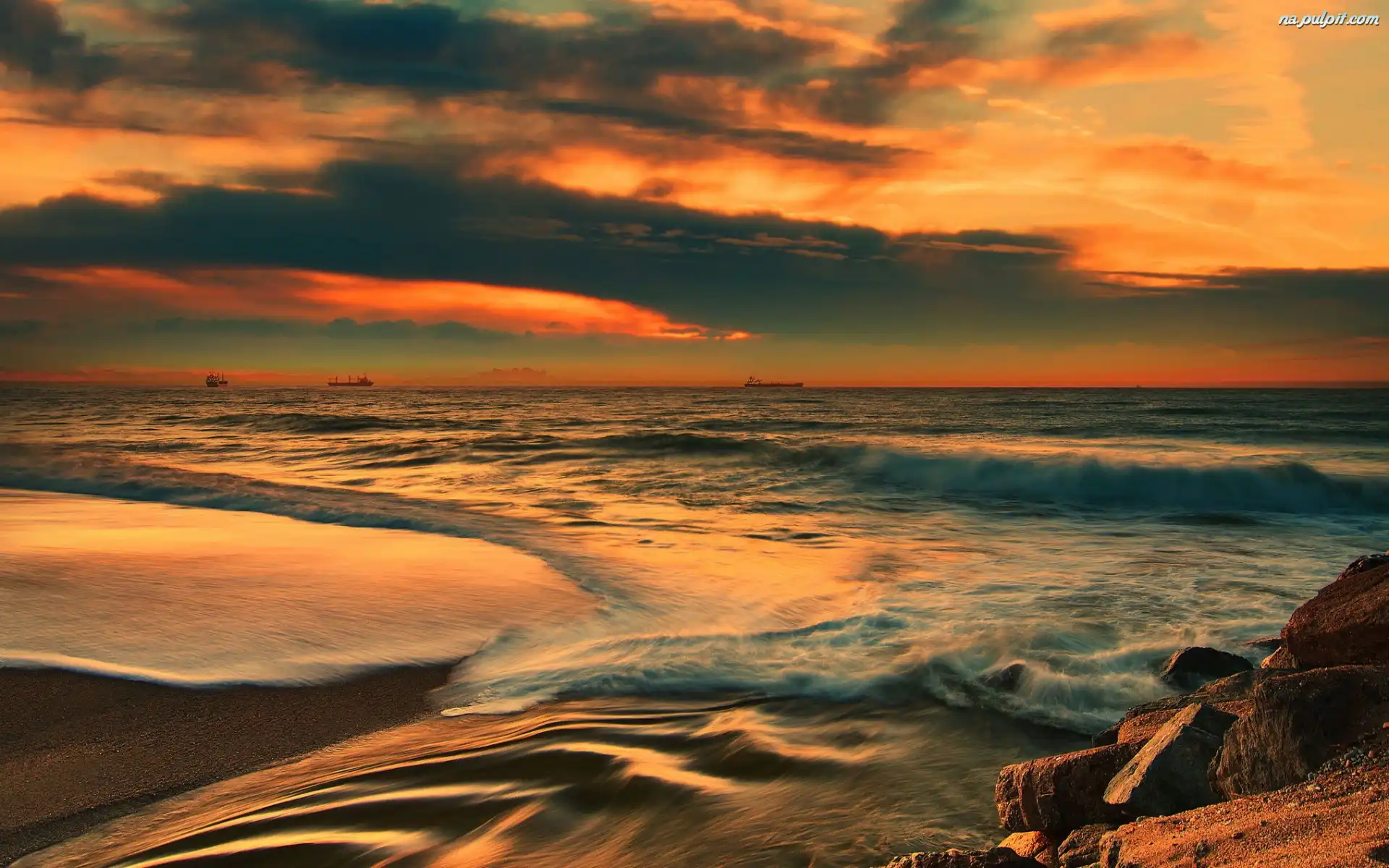 Fale, Zachód, Słońca, Skały, Morze, Statki Na Pulpit