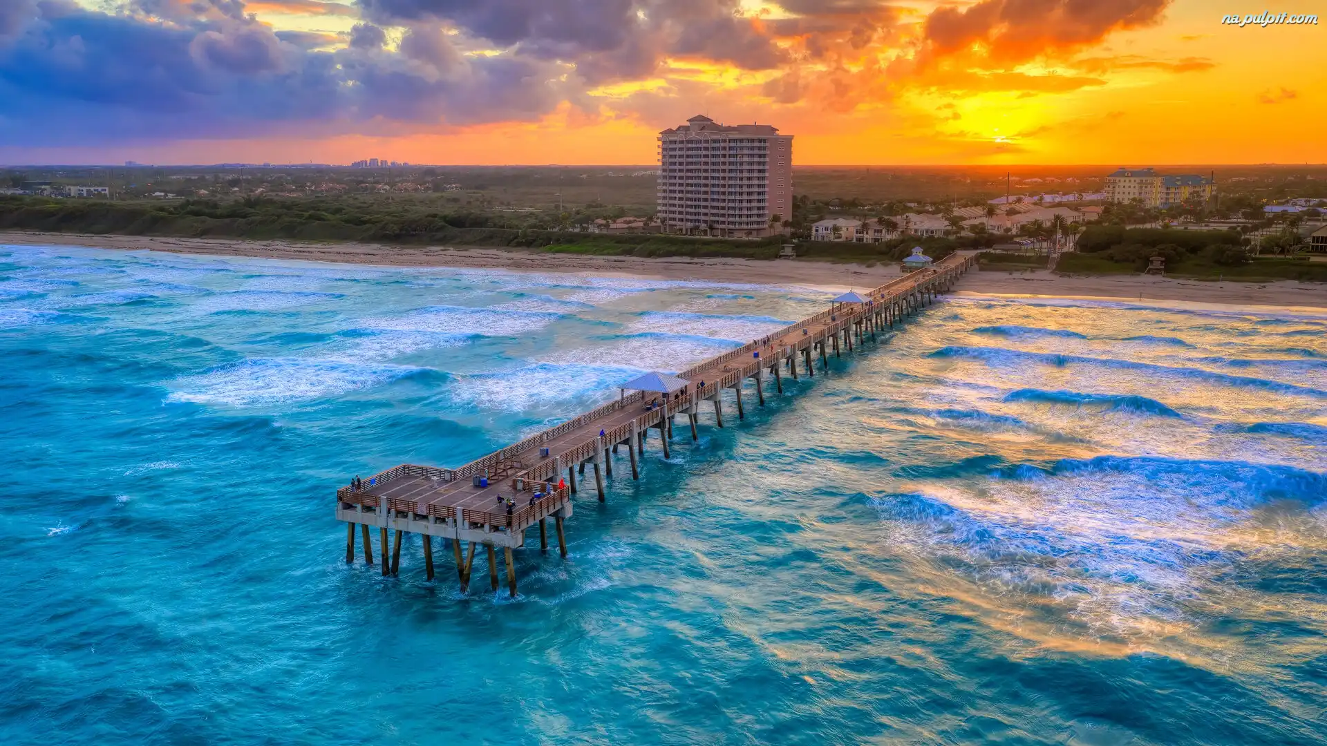 Fale, Domy, Juno Beach Pier, Molo, Juno Beach, Floryda, Stany Zjednoczone, Plaża, Morze, Zachód słońca Na Pulpit |