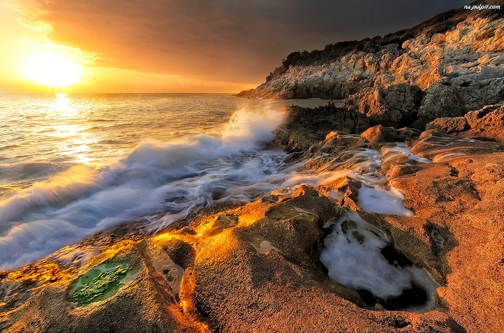 Fale, Morze, Słońca, Zachód, Skały Na Pulpit
