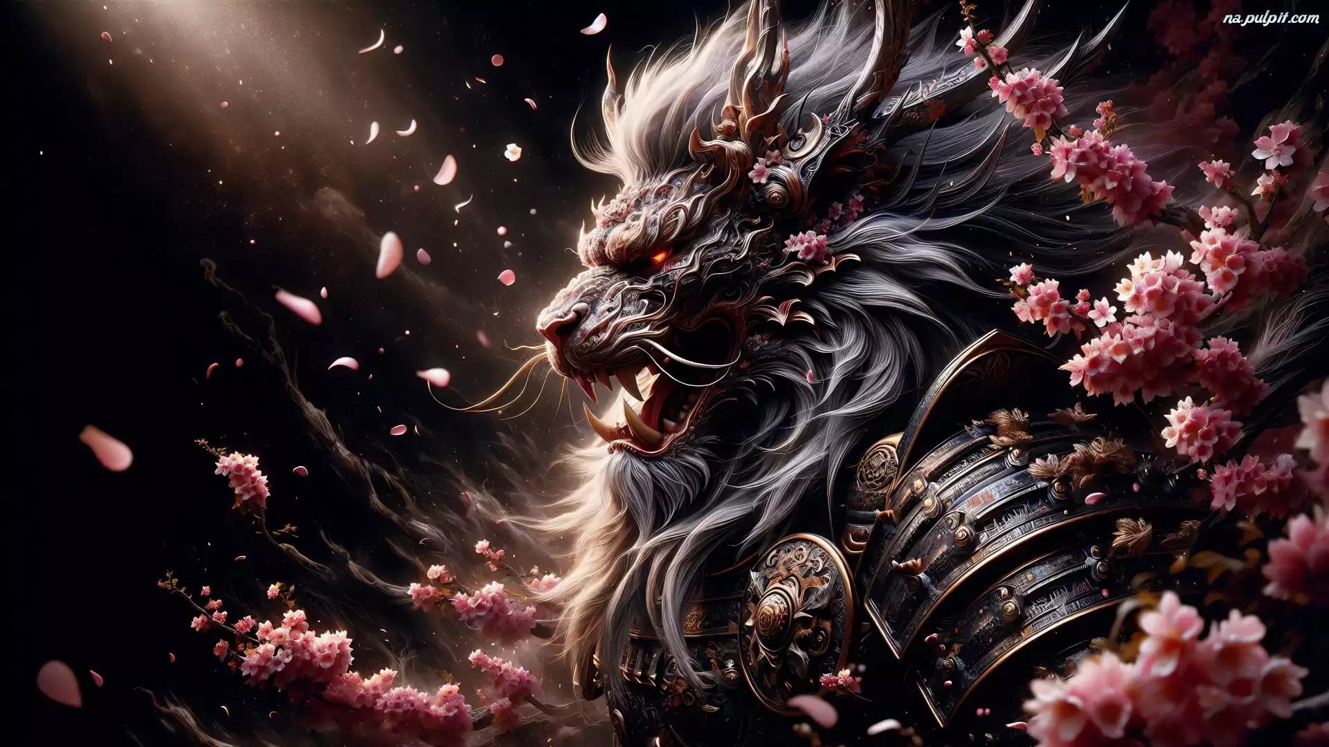 Kwiaty, Zbroja, Kły, Fantasy, Groźny, Lew, Różowe Na Pulpit