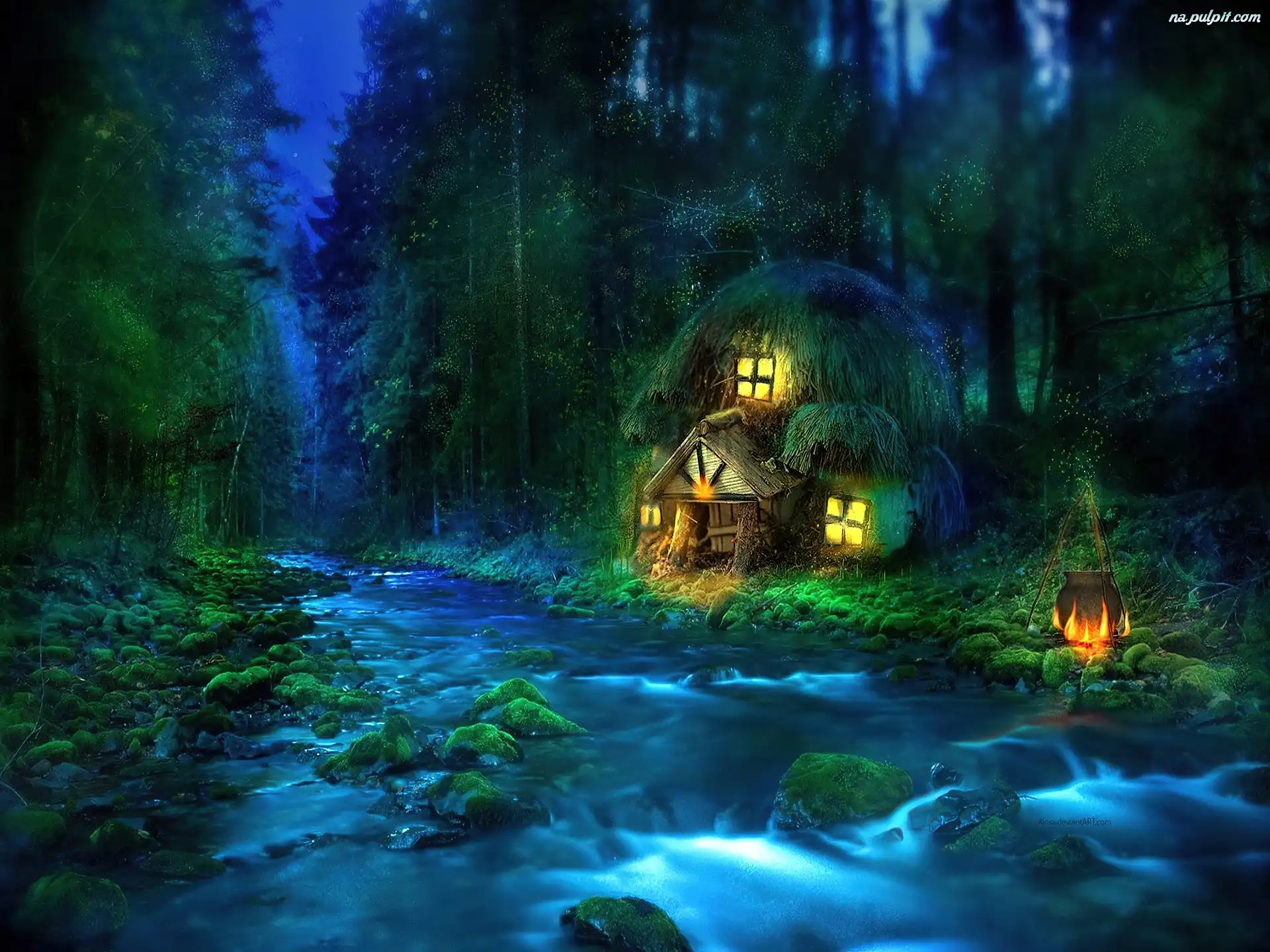 Fantasy, Woda, Domek, Las, Noc Na Pulpit