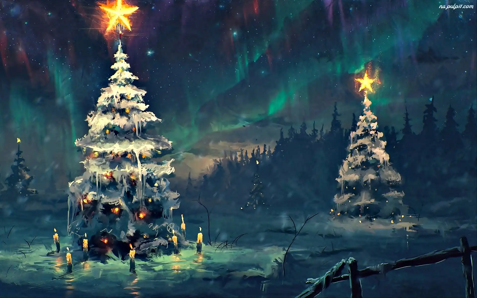 Fantasy, Choinki, Zima, Zorza Polarna, Noc Na Pulpit