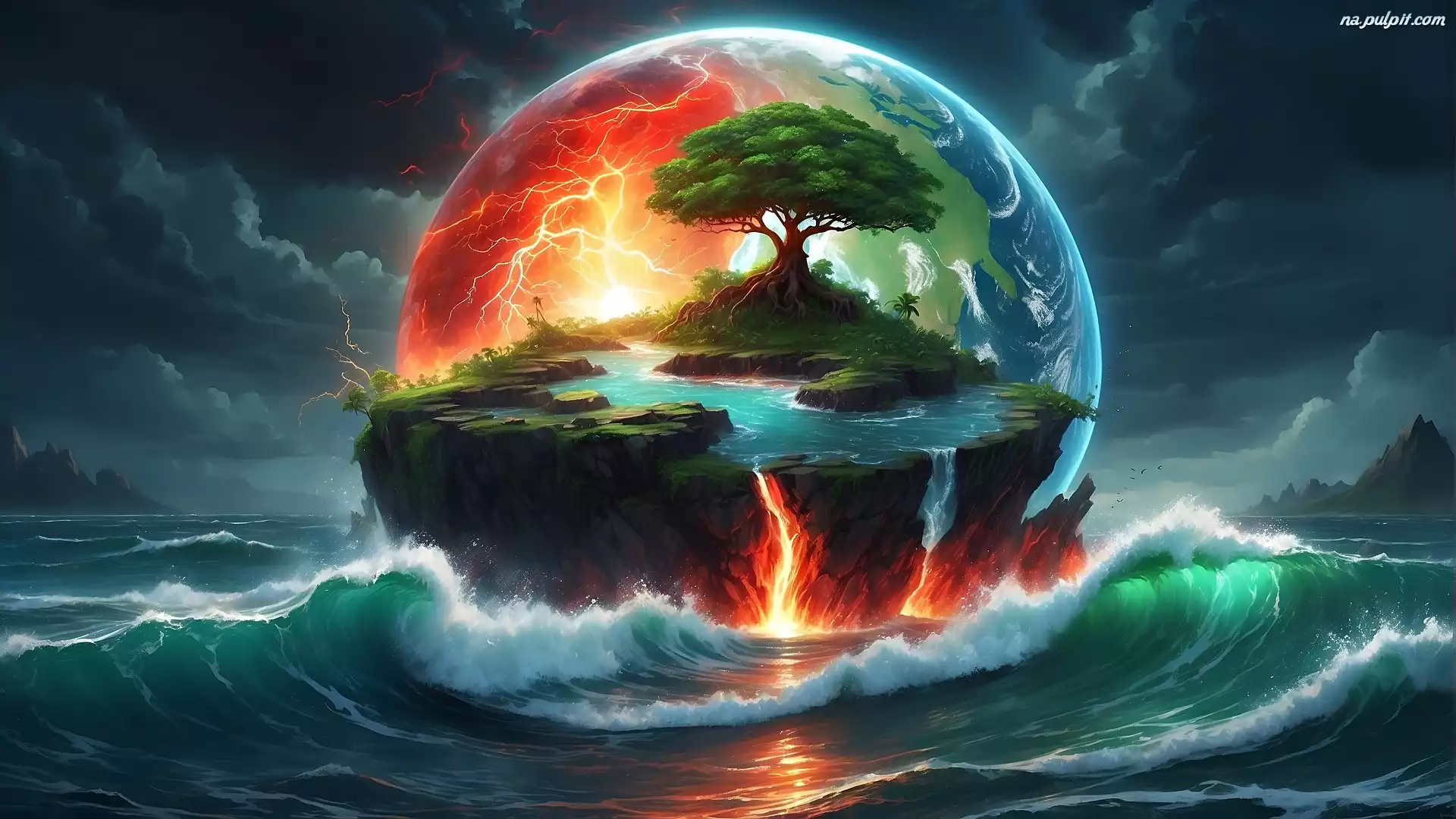 Pioruny, Drzewo, Wyspa, Fantasy, Morze, Planeta, Ogień Na Pulpit