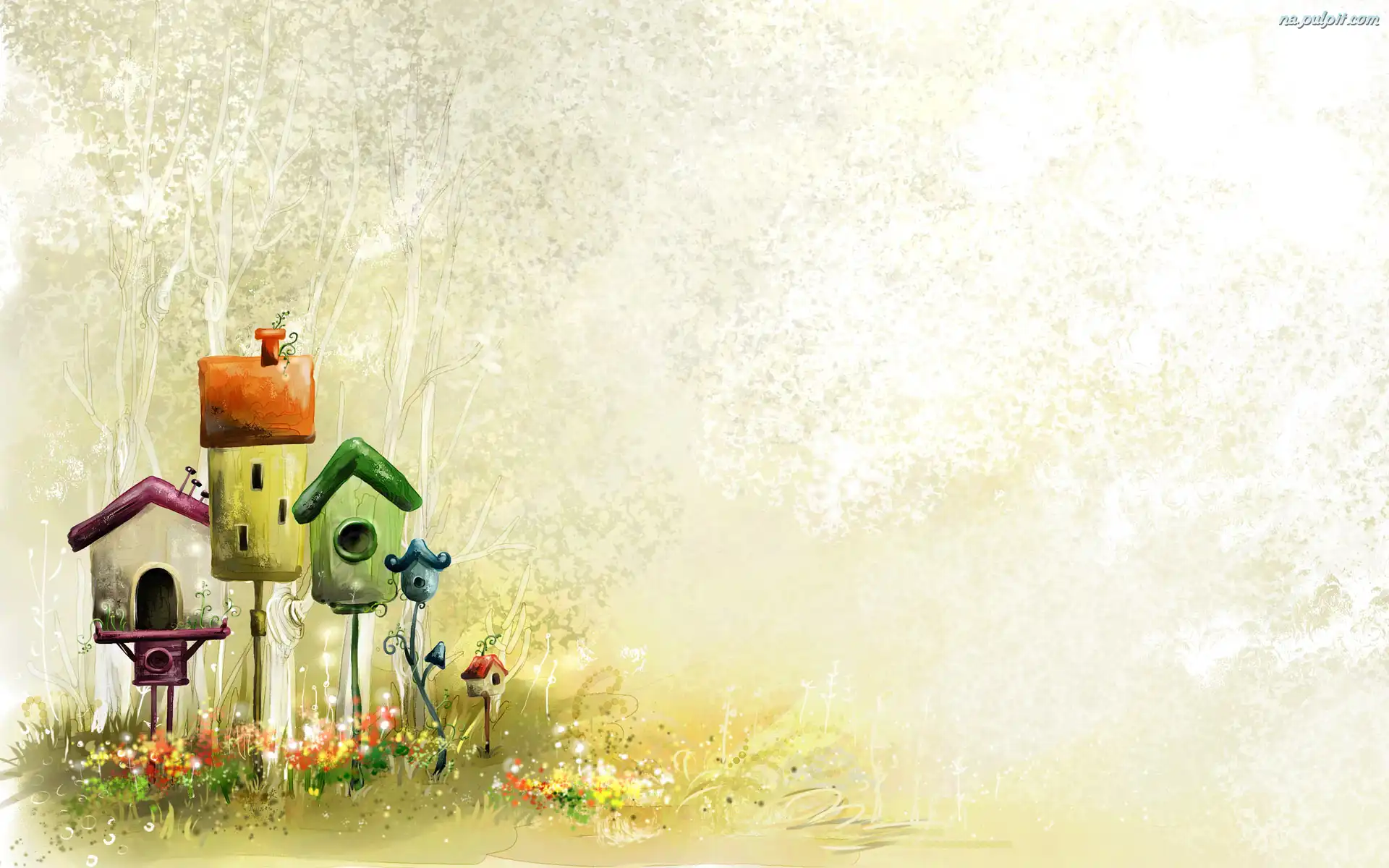 Fantazja, Drzewa, Domki, Trzy, Kwiaty Na Pulpit
