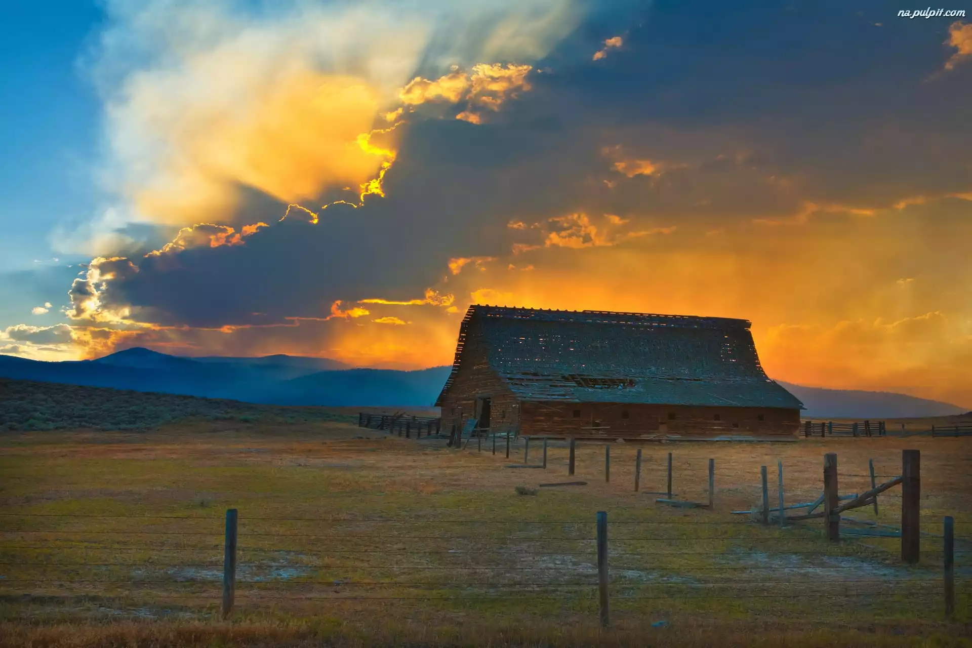 Farma, Słońce, Przebijające, Chmury, Szopa