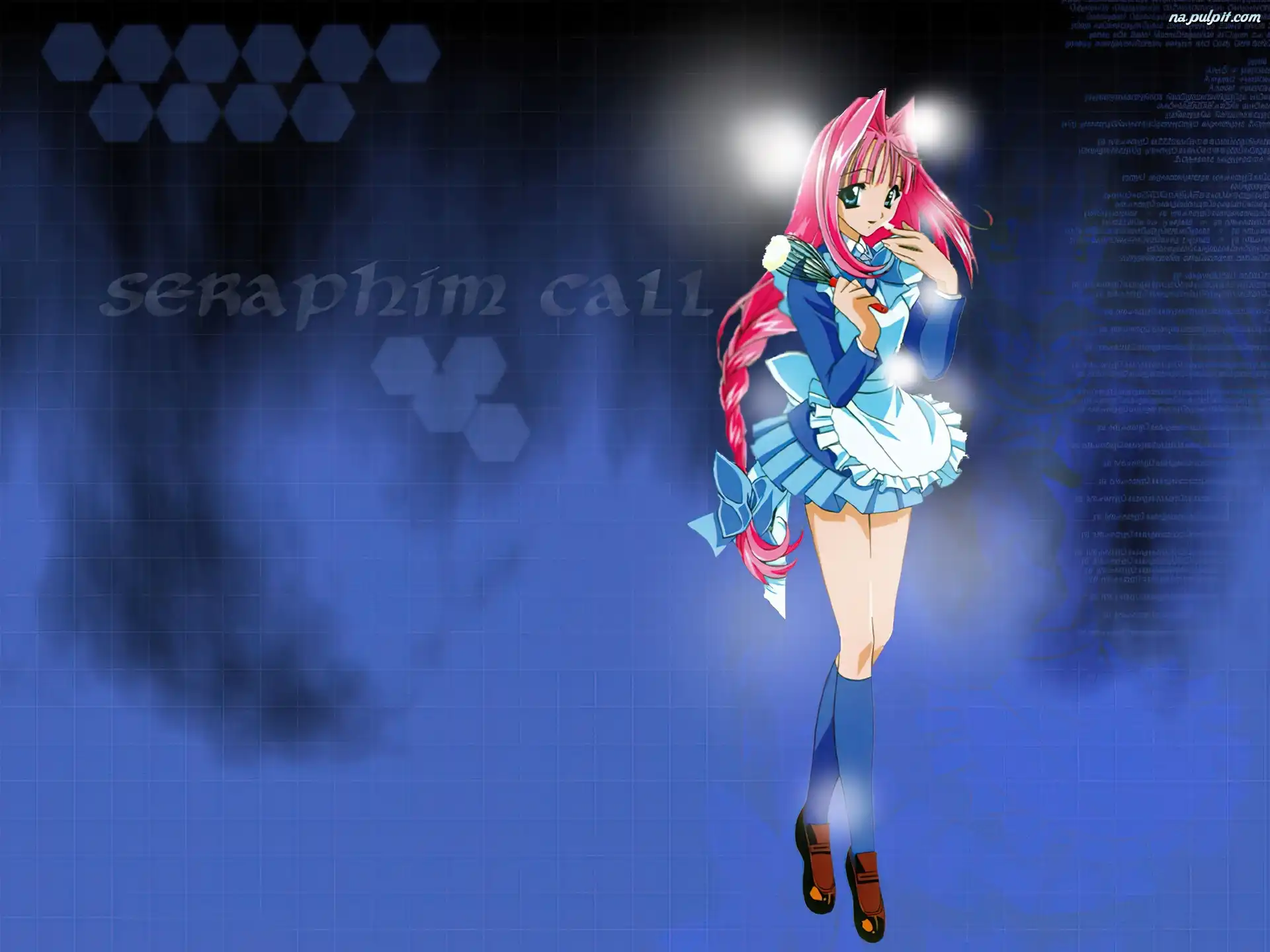 serca, Seraphim Call, niebieskie oczy Seraphim Call, niebieska sukienka fartuszek, Seraphim Call, długie nogi Seraphim Call, różowe włosy Seraphim Call, para czarna sukienka, Seraphim Call, serca