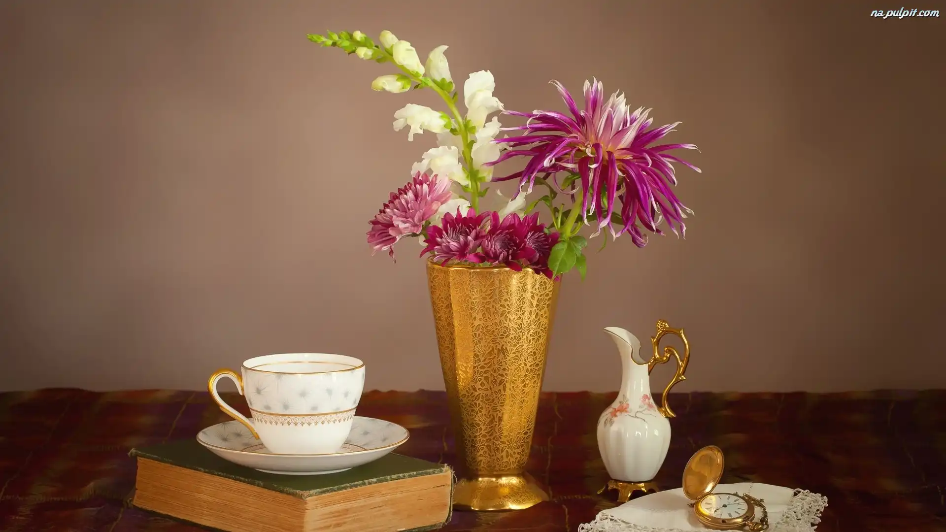 Książka, Kwiaty, Astry, Wazon, Dzbanuszek, Serwetka, Zegarek, Kompozycja, Filiżanka