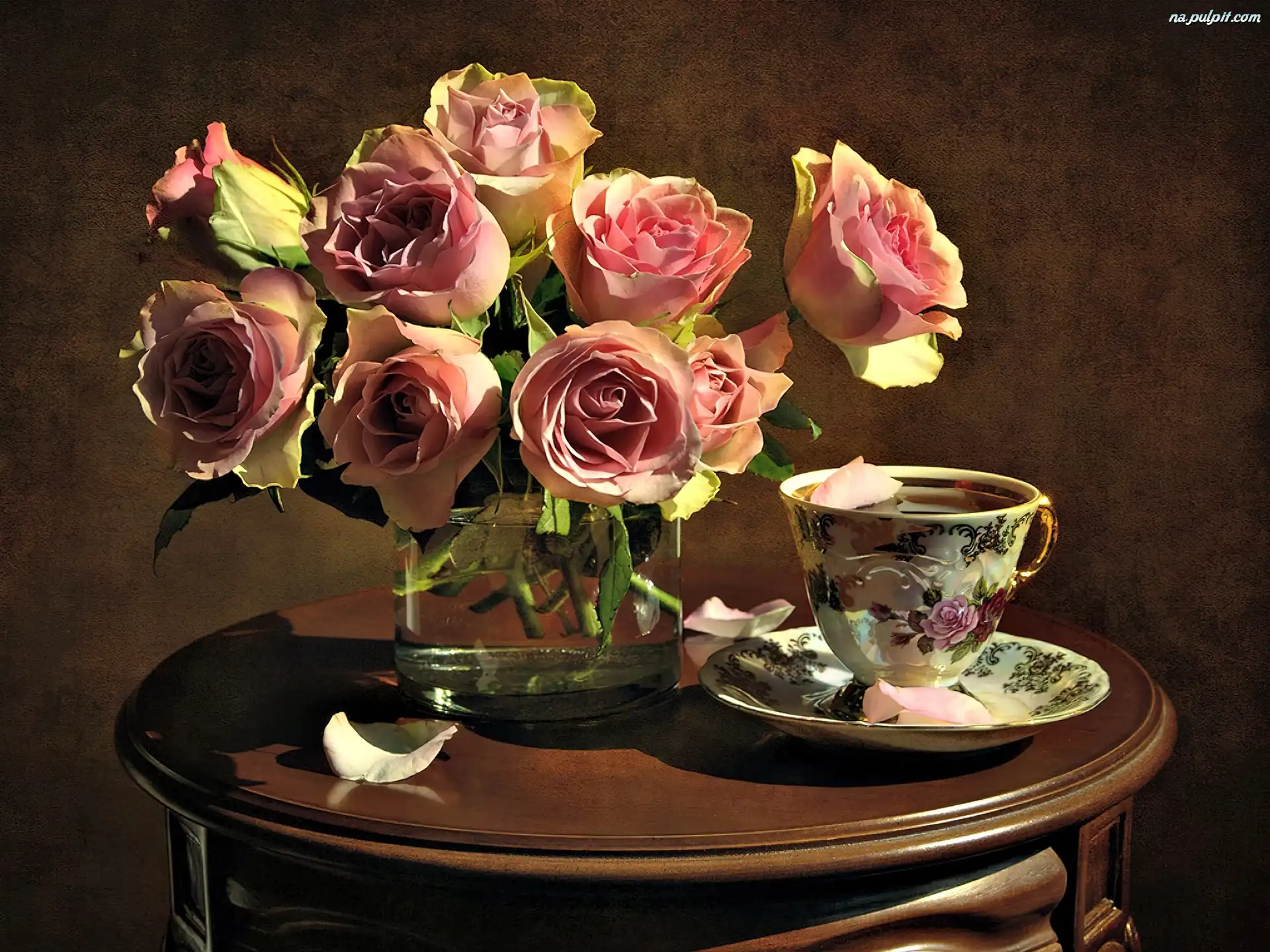 Filiżanka, Róż, Bukiet, Stolik Na Pulpit