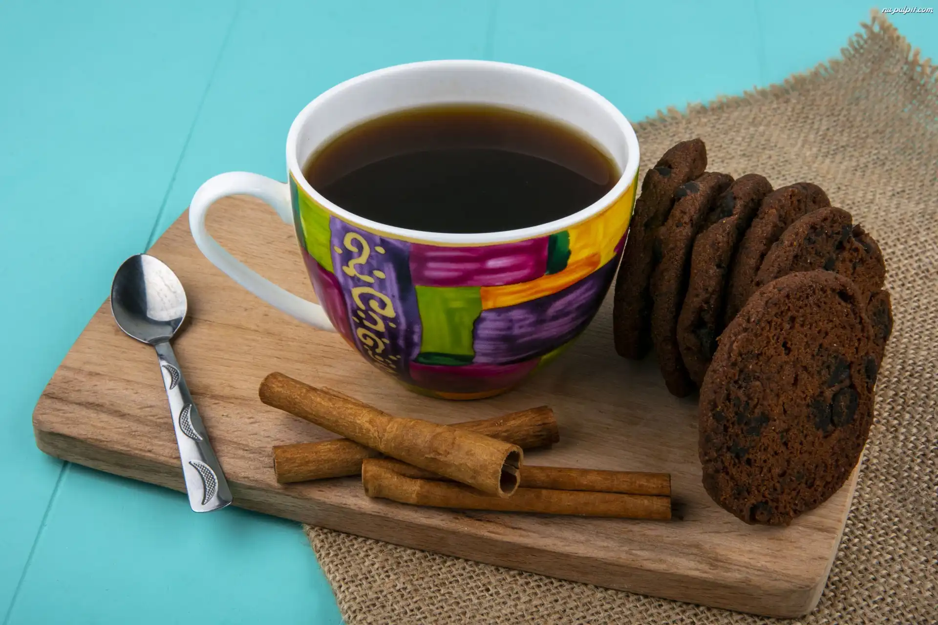 Deski, Filiżanka, Serweta, Ciasteczka, Cynamon, Kawa, Łyżeczka