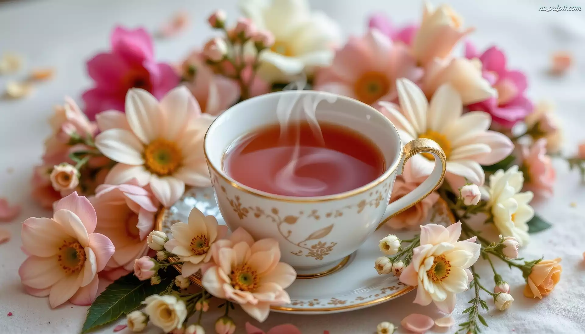 Kolorowe, Filiżanka, Herbata, Kwiaty, Talerzyk Na Pulpit