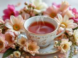 Kolorowe, Filiżanka, Herbata, Kwiaty, Talerzyk