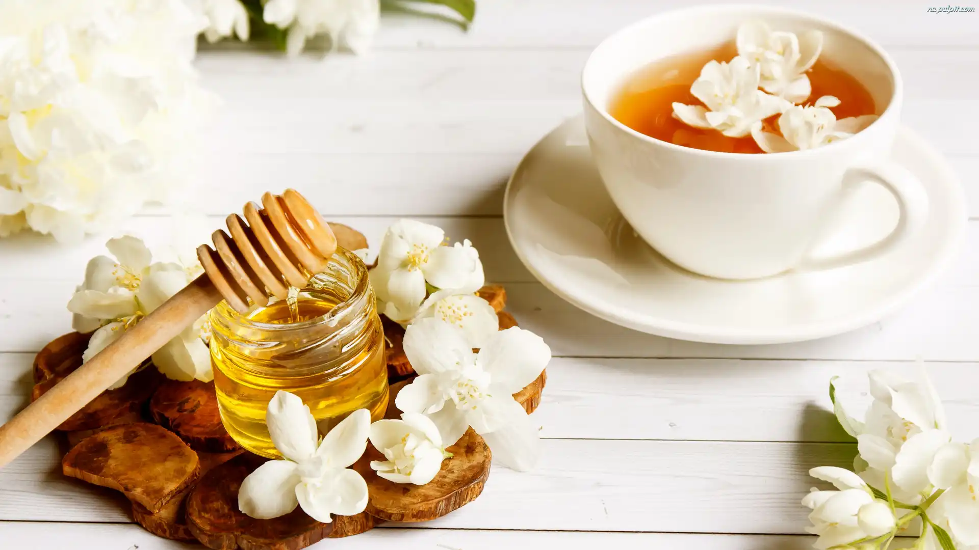 Kompozycja, Filiżanka, Miód, Kwiaty, Białe, Herbata jaśminowa, Jaśmin Na Pulpit