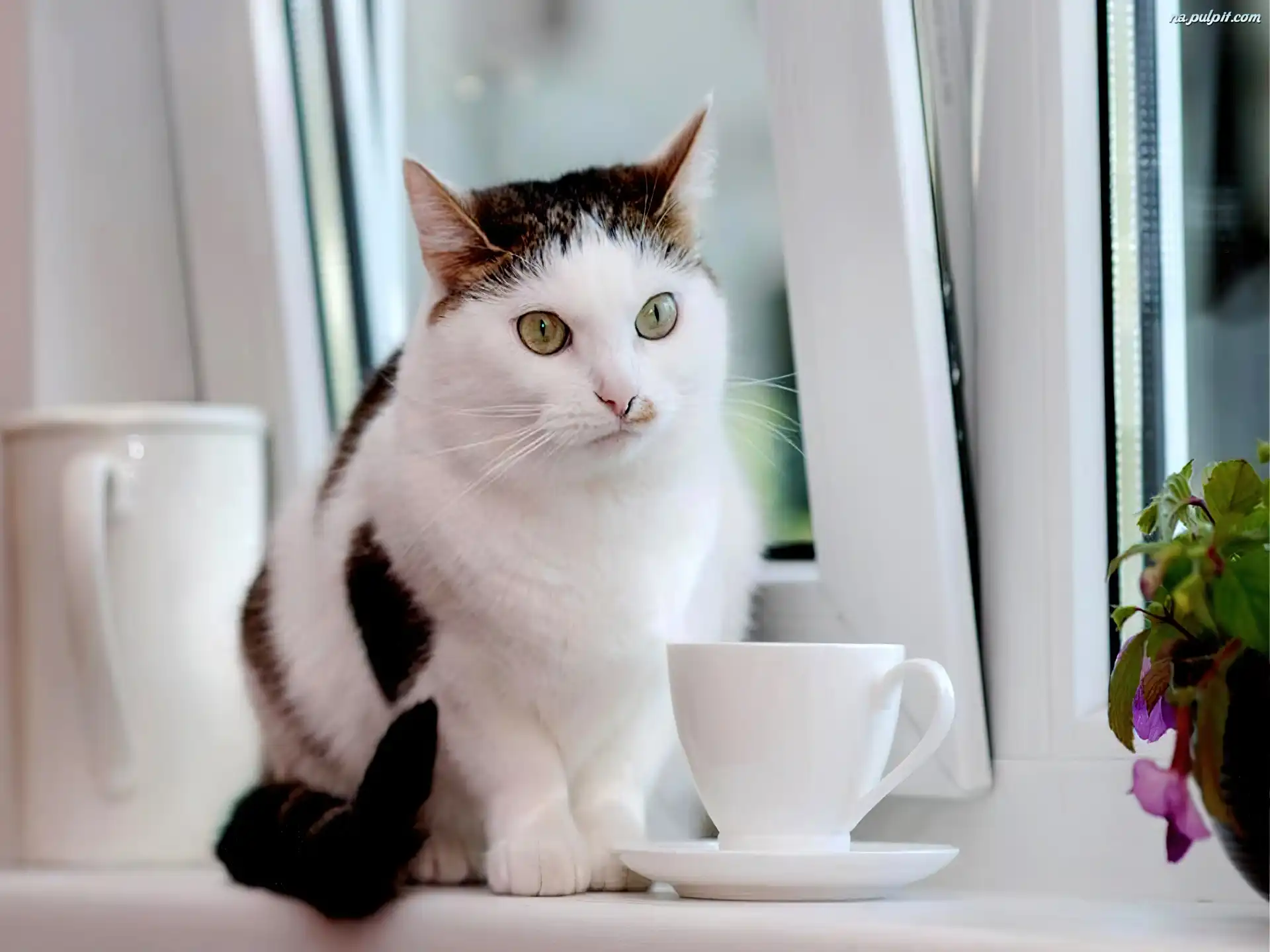 Filiżanka, Biało, Kot, Czarny Na Pulpit