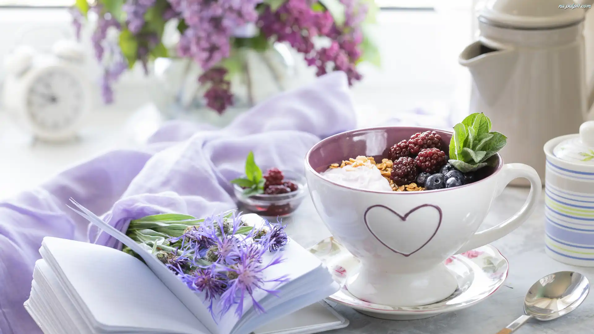 Filiżanka, Notatnik, Kwiaty, Musli, Śniadanie, Jagody Na Pulpit