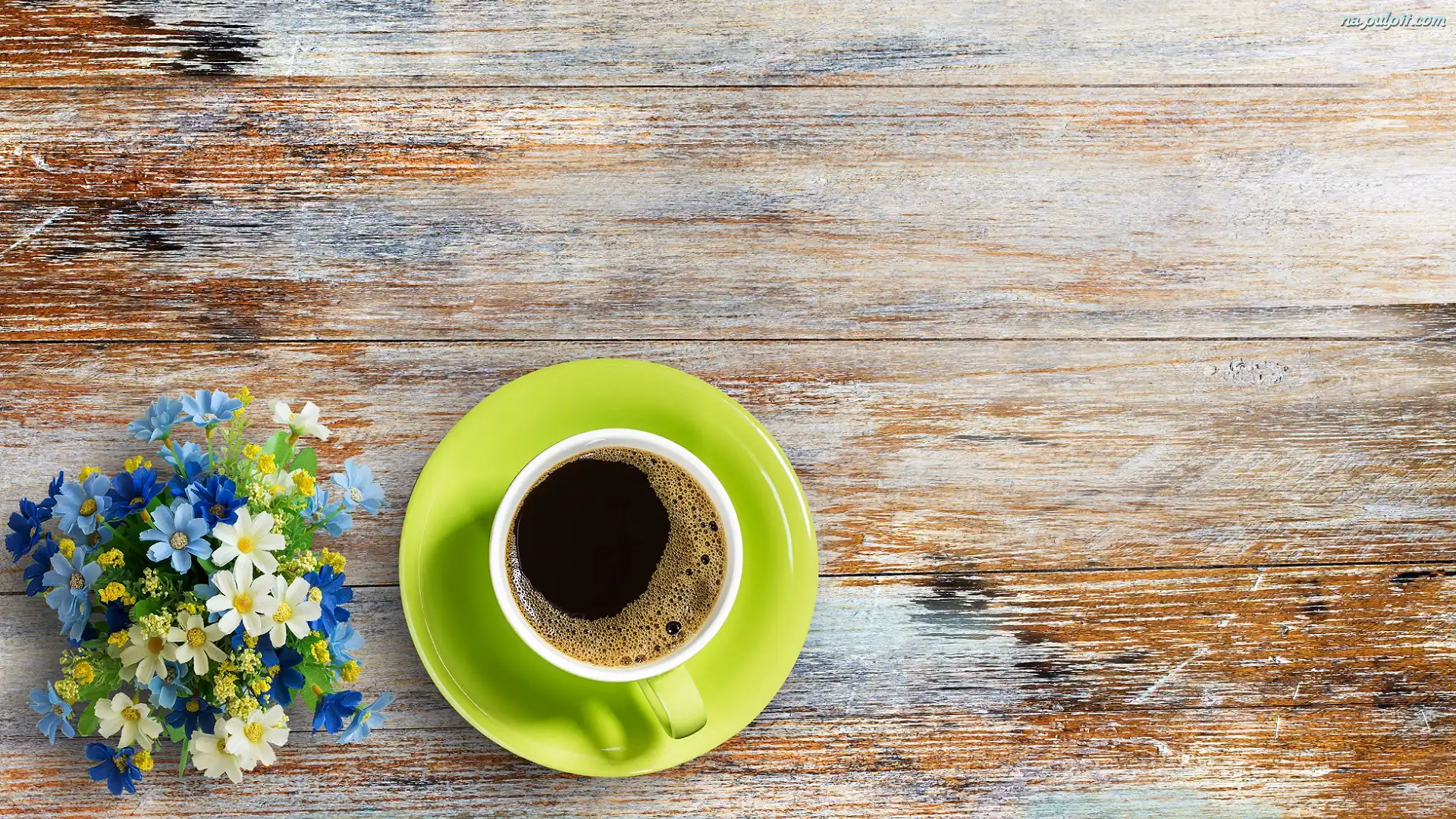 Spodek, Biało-niebieskie, Kwiaty, Kawa, Deski, Zielona, Bukiet, Filiżanka