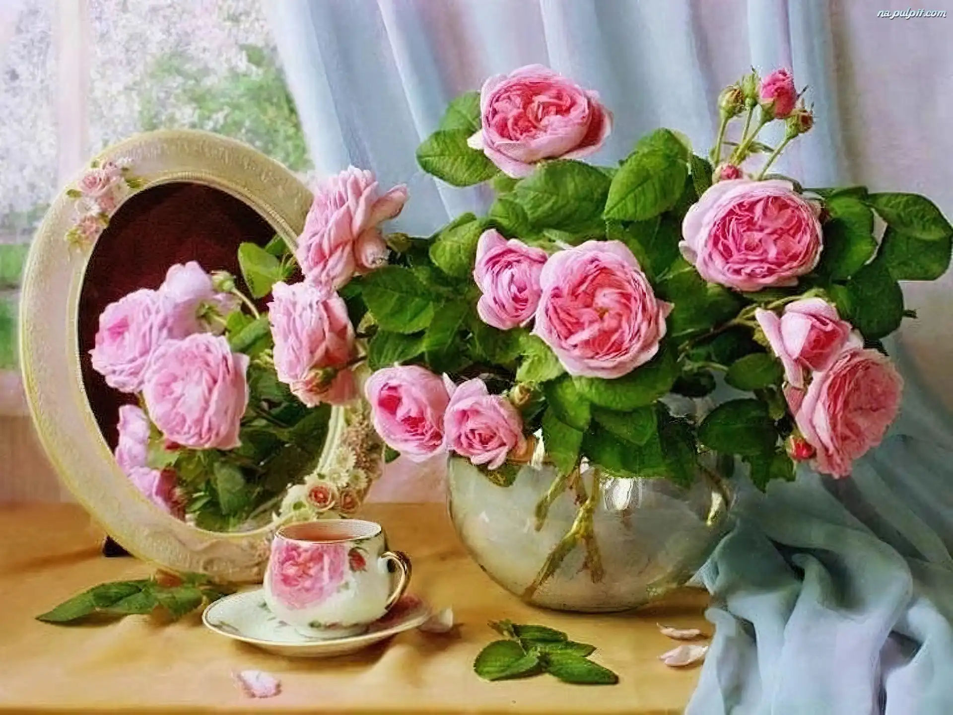 Filiżanka, Wazon, Róże, Różowe, Lusterko Na Pulpit