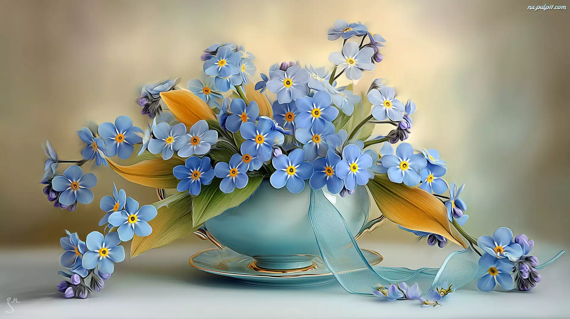 Niezapominajki, Filiżanka, Wstążka, Grafika AI Na Pulpit