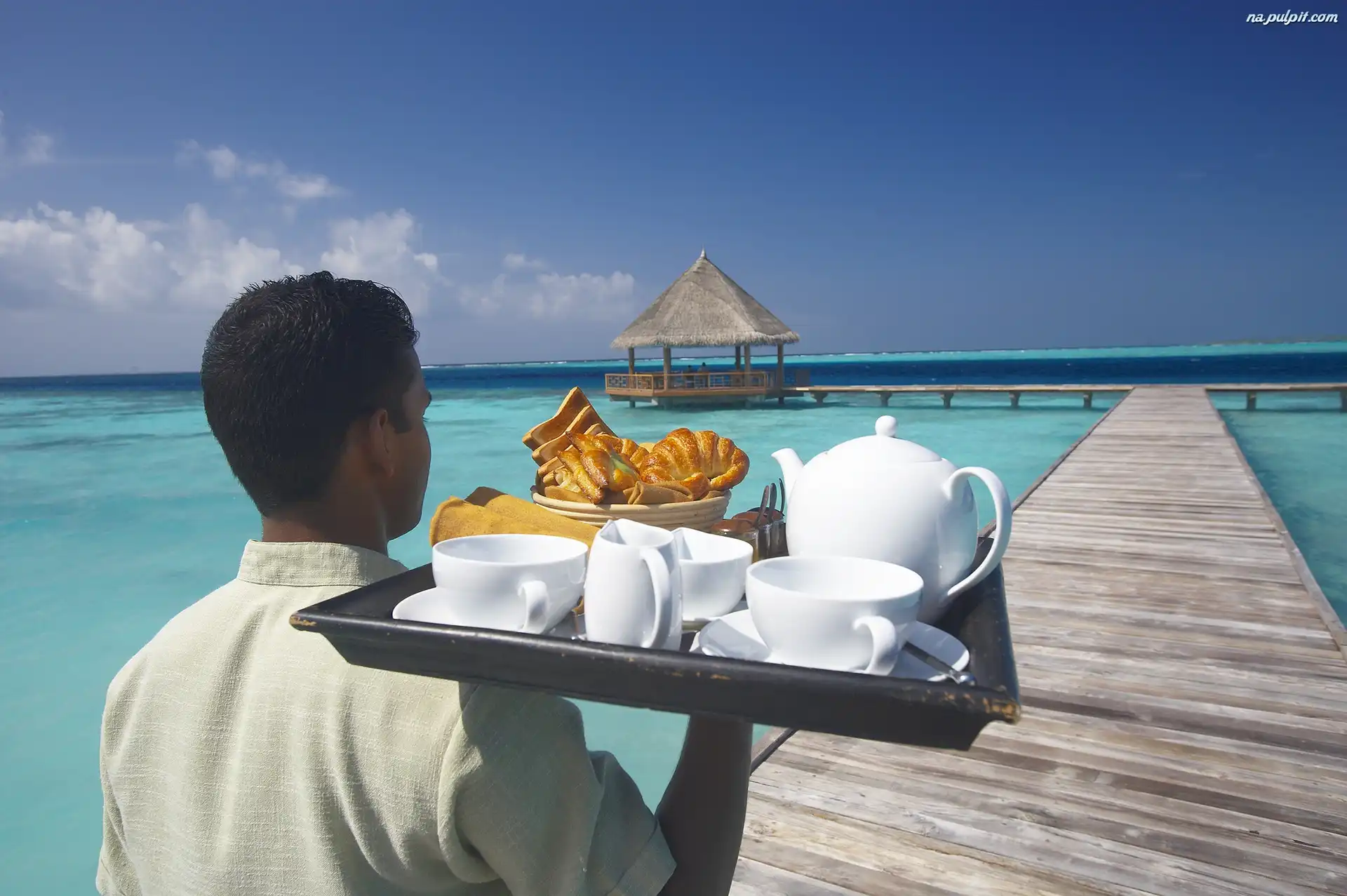 Filiżanki, Mężczyzna, Molo, Morze, Taca
