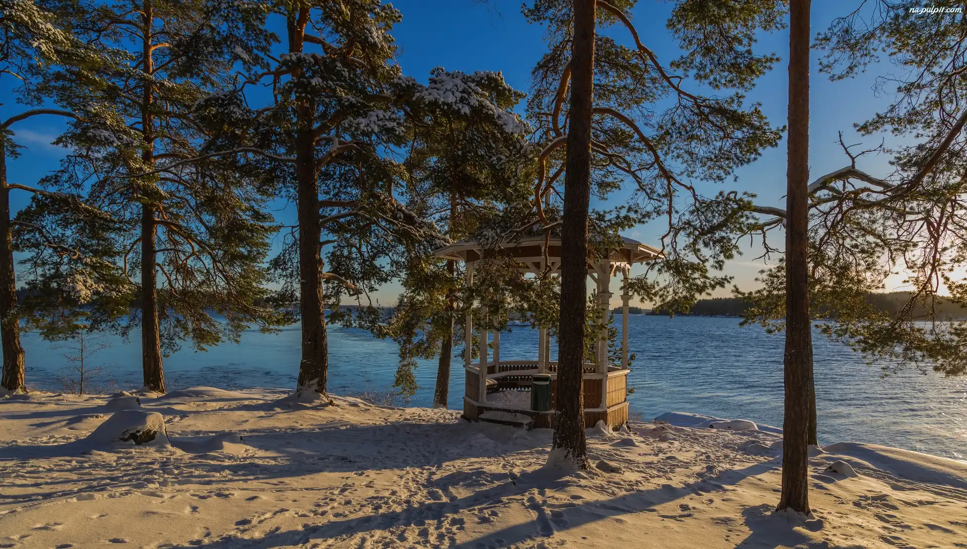 Finlandia, Śnieg, Jezioro, Drzewa, Zima, Altanka