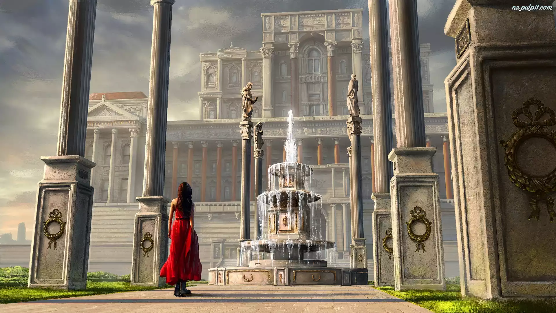 Dziewczyna, Dom, Pałac, Czerwona, Sukienka, Kolumny, Digital Art, Fontanna Na Pulpit