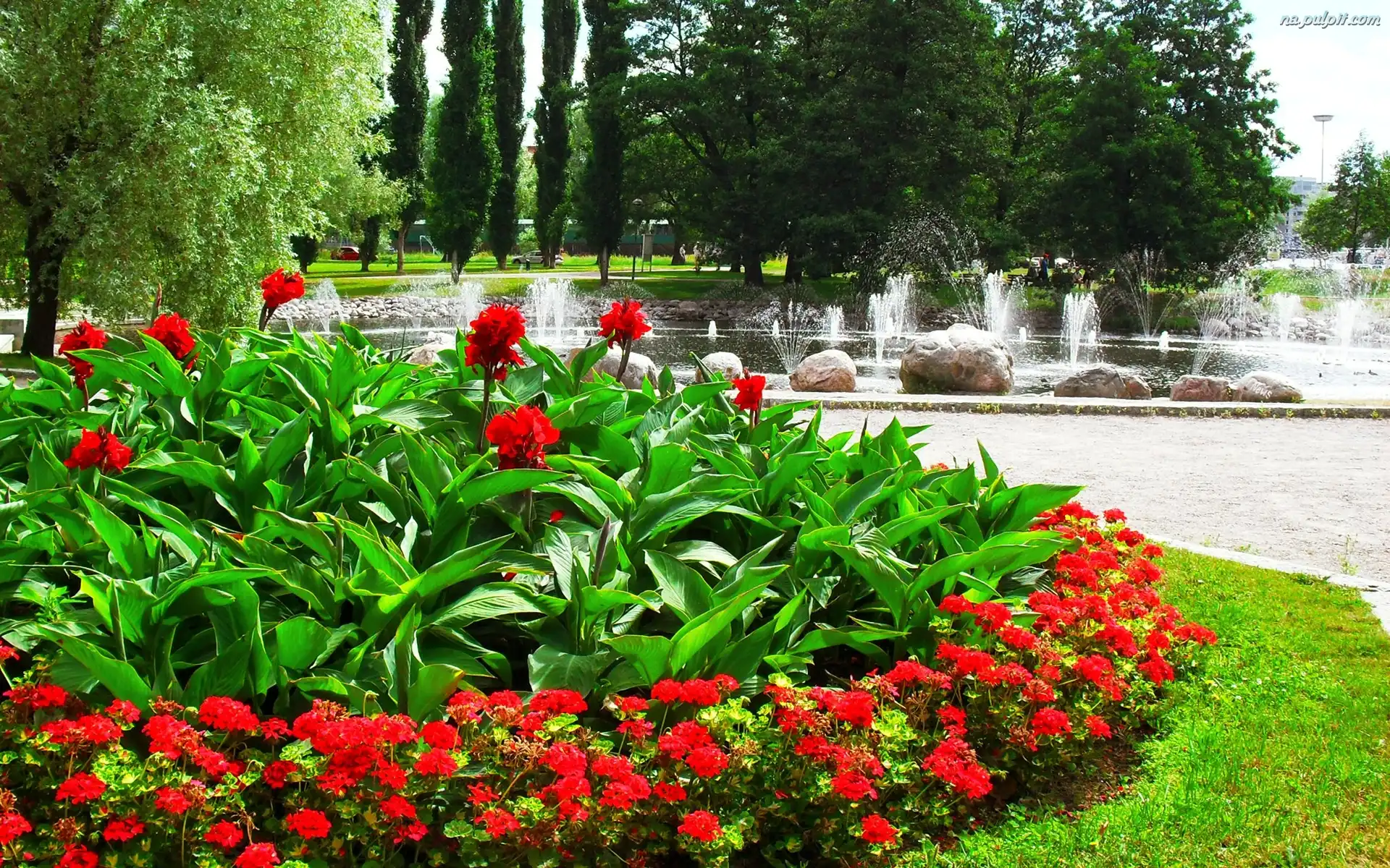 Fontanna, Czerwone, Klomb, Park, Kwiaty Na Pulpit