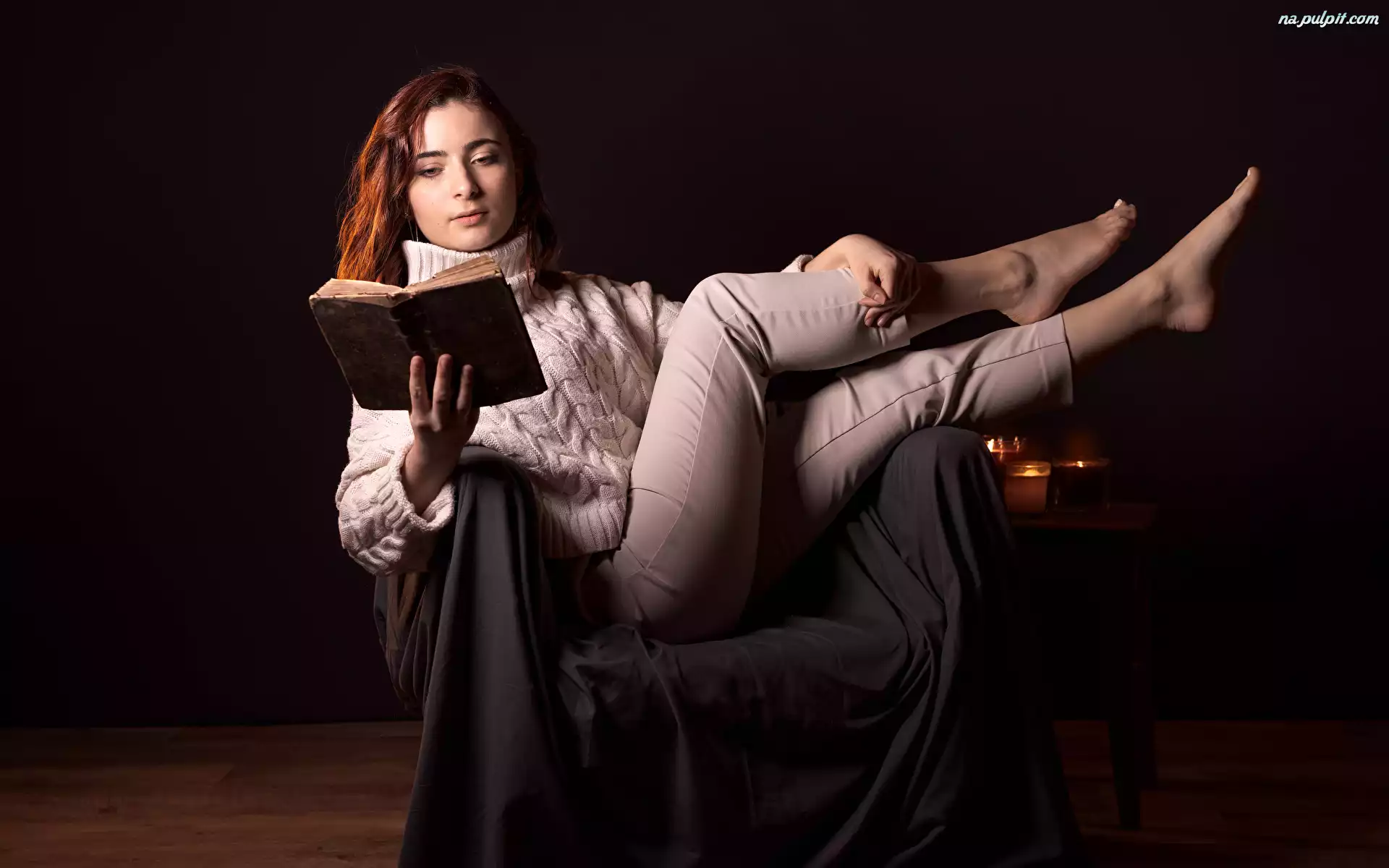 Książka, Kobieta, Spodnie, Fotel, Sweter, Ciemne tło