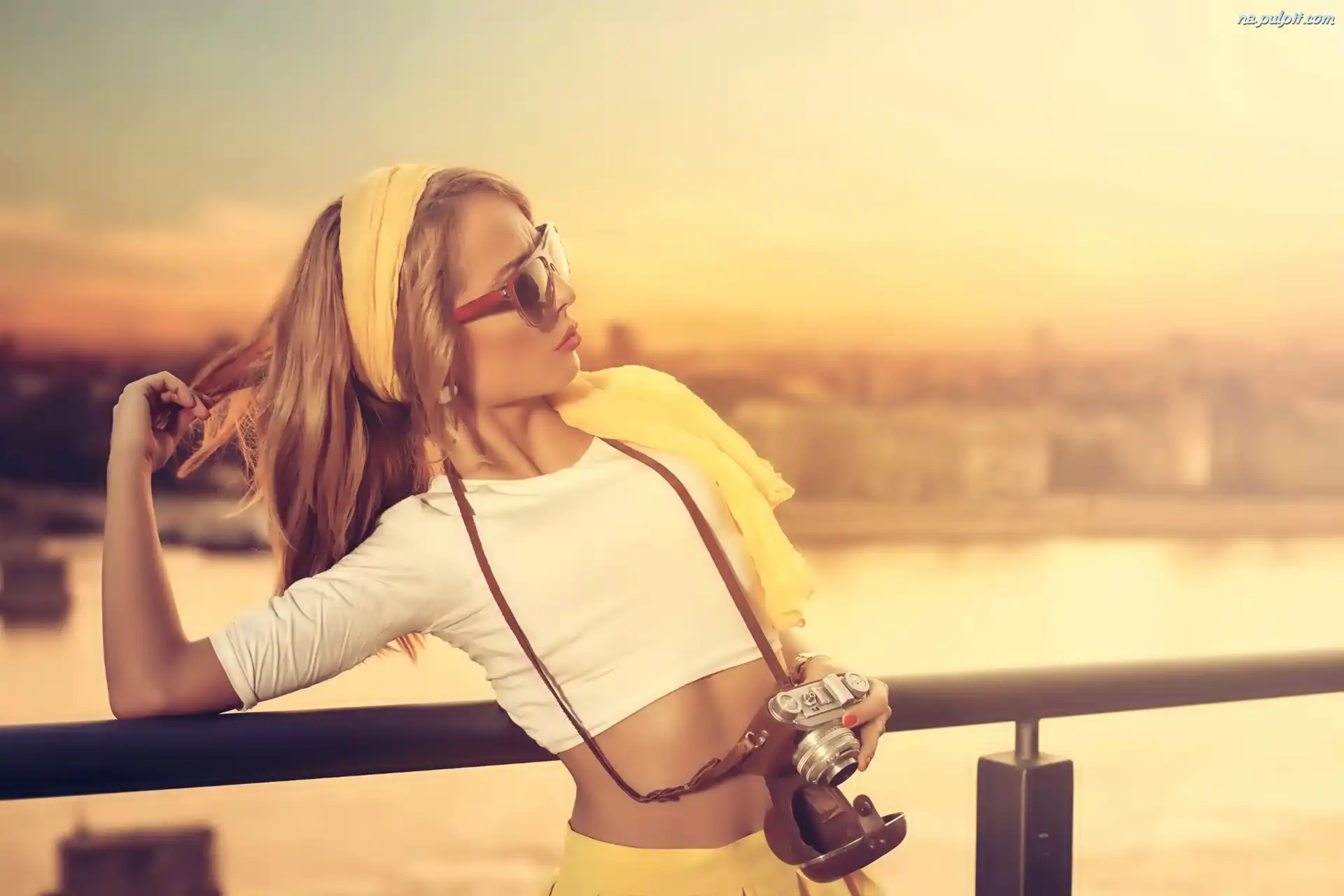 Fotograficzny, Okulary, Kobieta, Rzeka, Aparat